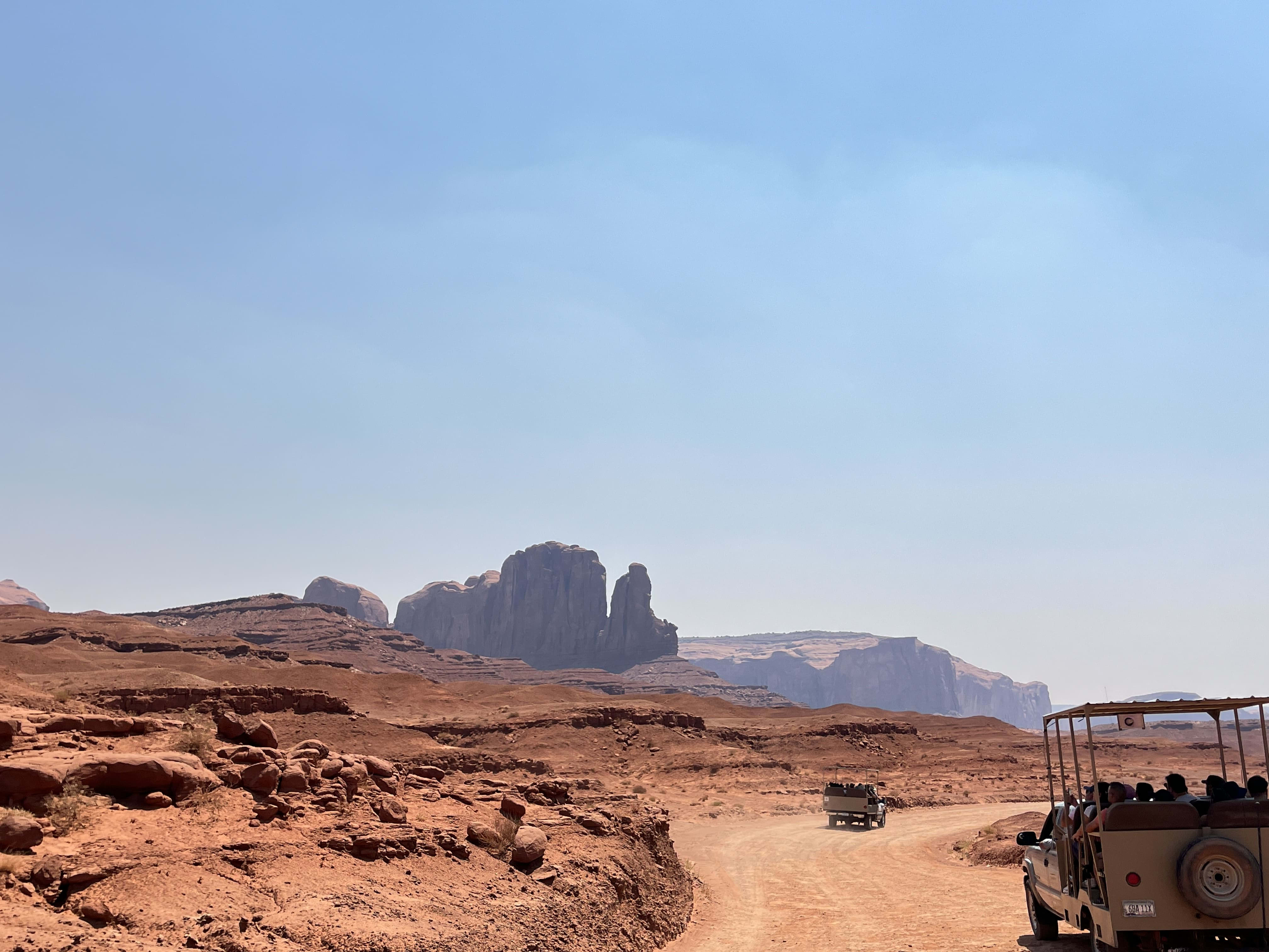 その後向かったのは、モニュメントバレー。ここではジープに乗って、砂漠の中を駆け抜ける体験ができました。目の前に広がる赤土の岩山や壁画、そしてネイティブアメリカンの住居を見ながら、彼らの生活や文化を肌で感じられるのが何よりの魅力です。西部劇のロケ地として有名な場所ということもあり、映画好きや詳しい人ならより一層楽しめそう。個人的には、お土産屋さんでトイストーリーのキャラクター・ウッディが付けているような保安官バッジを見つけた瞬間、思わずテンションが上がりました。