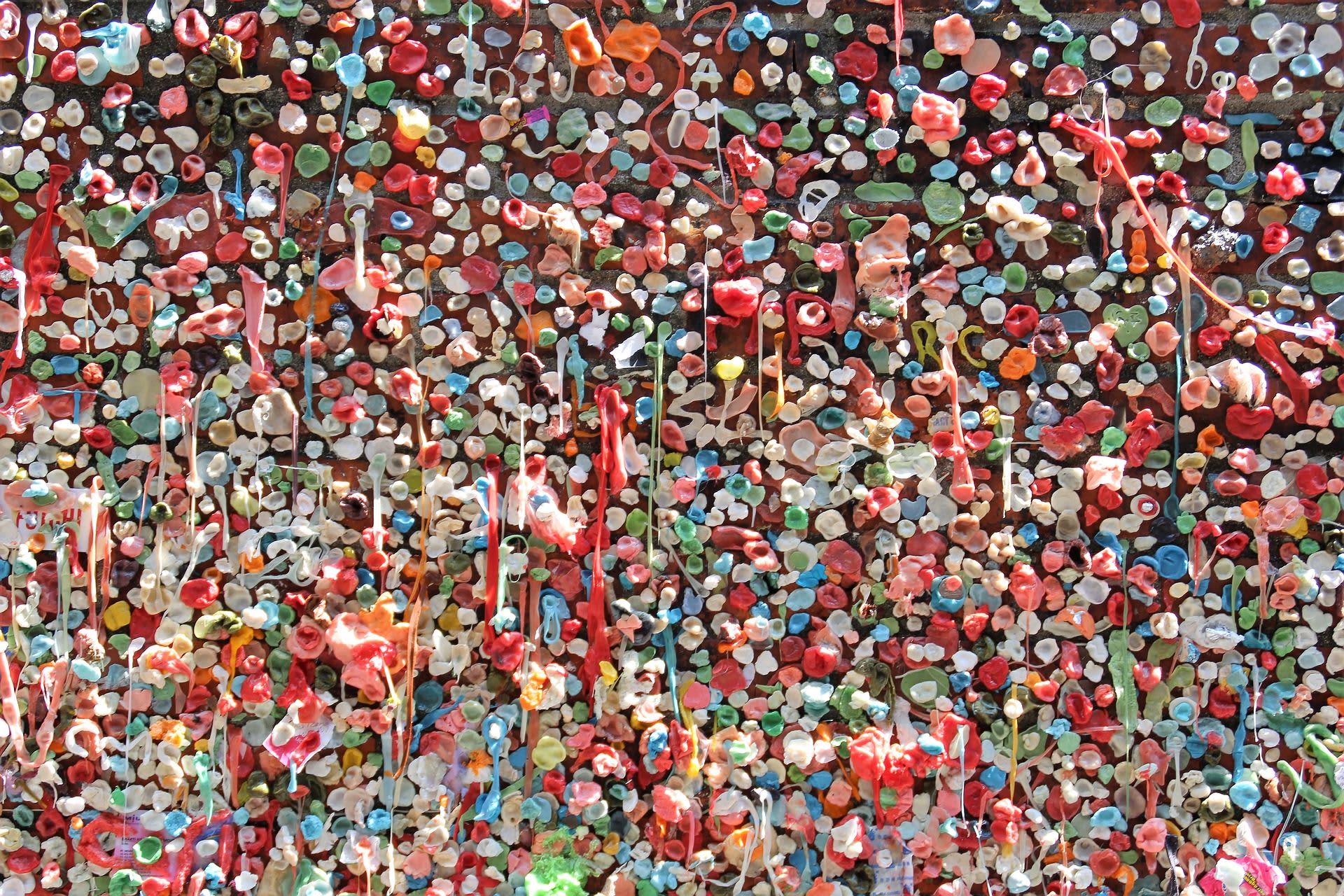 パイクプレイスマーケットの裏通りにある使用済みのガムが大量に貼り付けられたレンガの壁。珍名所。