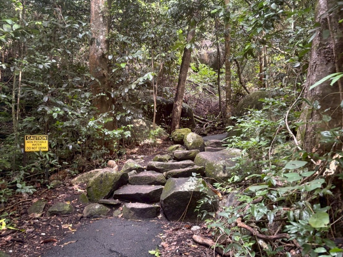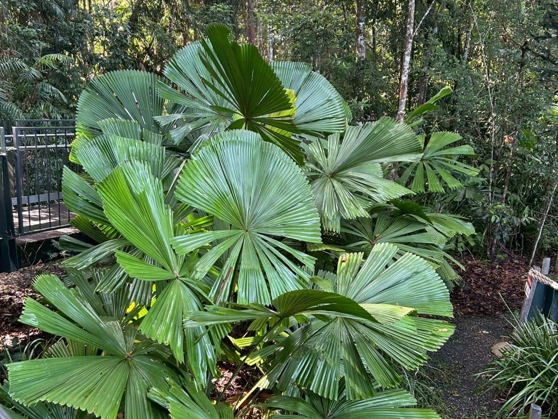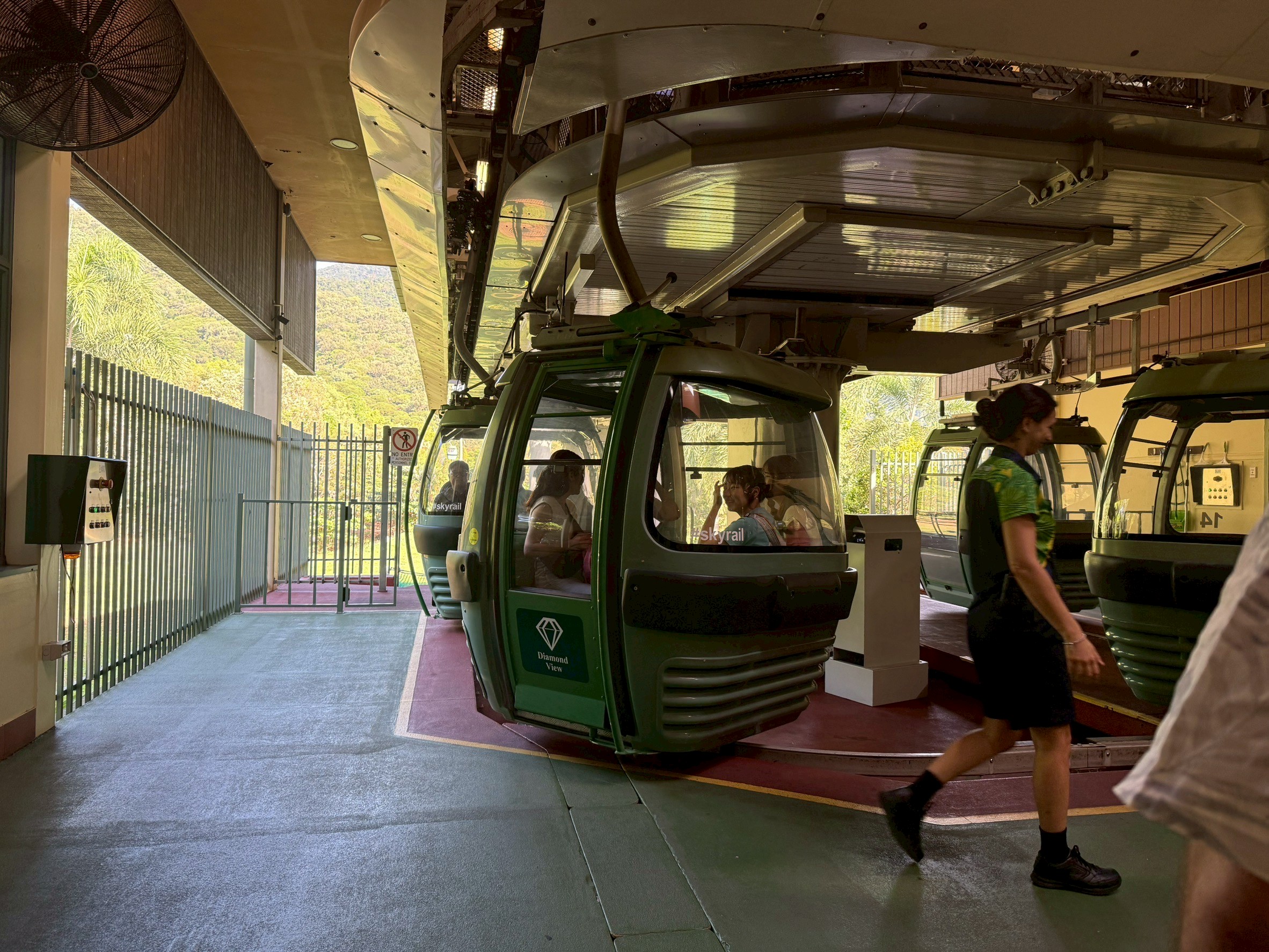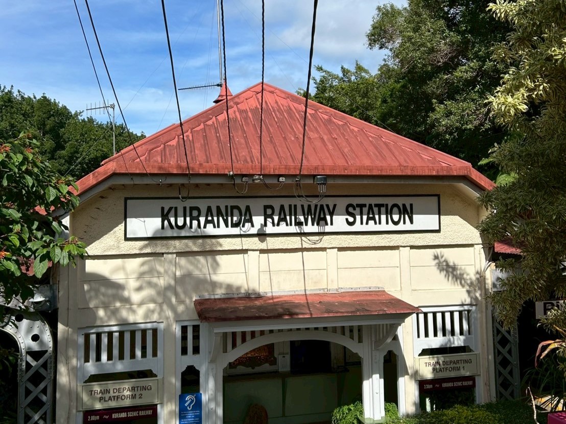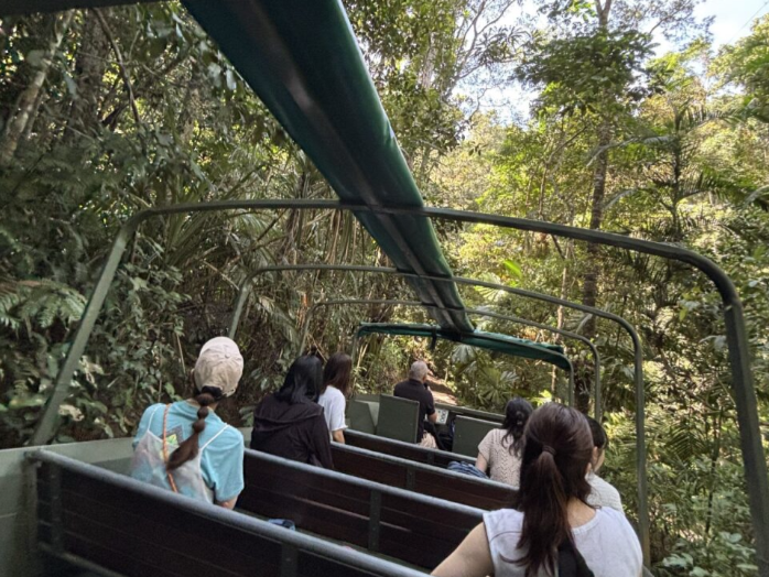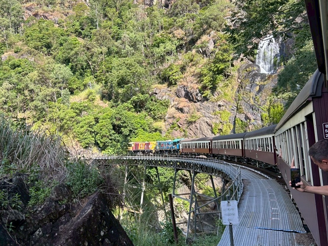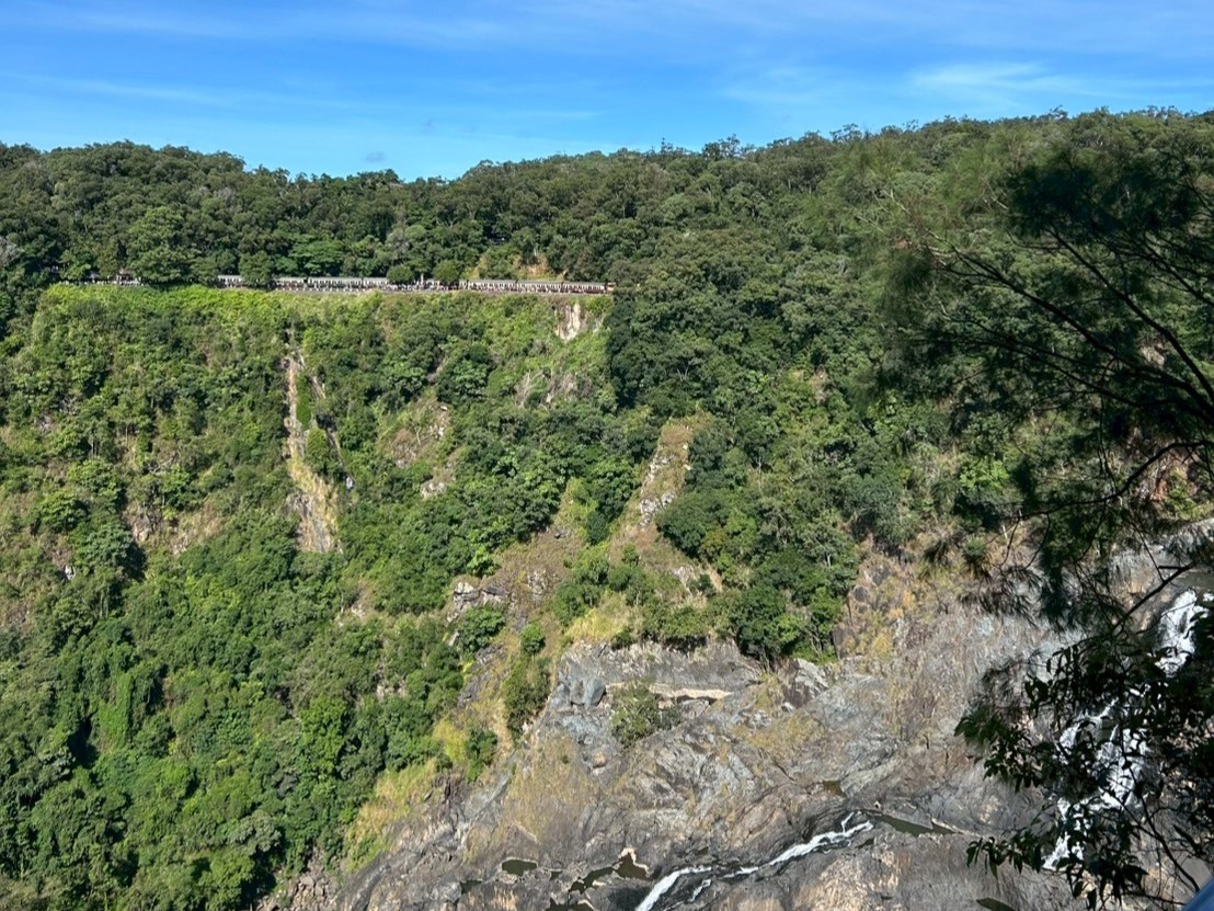 私たちはゴンドラでキュランダ村へ向かいました。ゴンドラの中ではキュランダ公式アプリより熱帯雨林の歴史を聞きながら景色を楽しめます。ゴンドラの中から熱帯雨林を見るだけではなく、2つの駅を経由しながらキュランダへ向かいます。それぞれの駅では一度ゴンドラを降りて、熱帯雨林の中を歩いて熱帯雨林ならではの植物を見たり触れたりしながら次の駅へ向います。バロンフォールズ駅では、乾季のため水の量が少なく滝の迫力はありませんでしたが、タイミングよくバロン滝とキュランダ鉄道を一緒に写真に収めることができました。