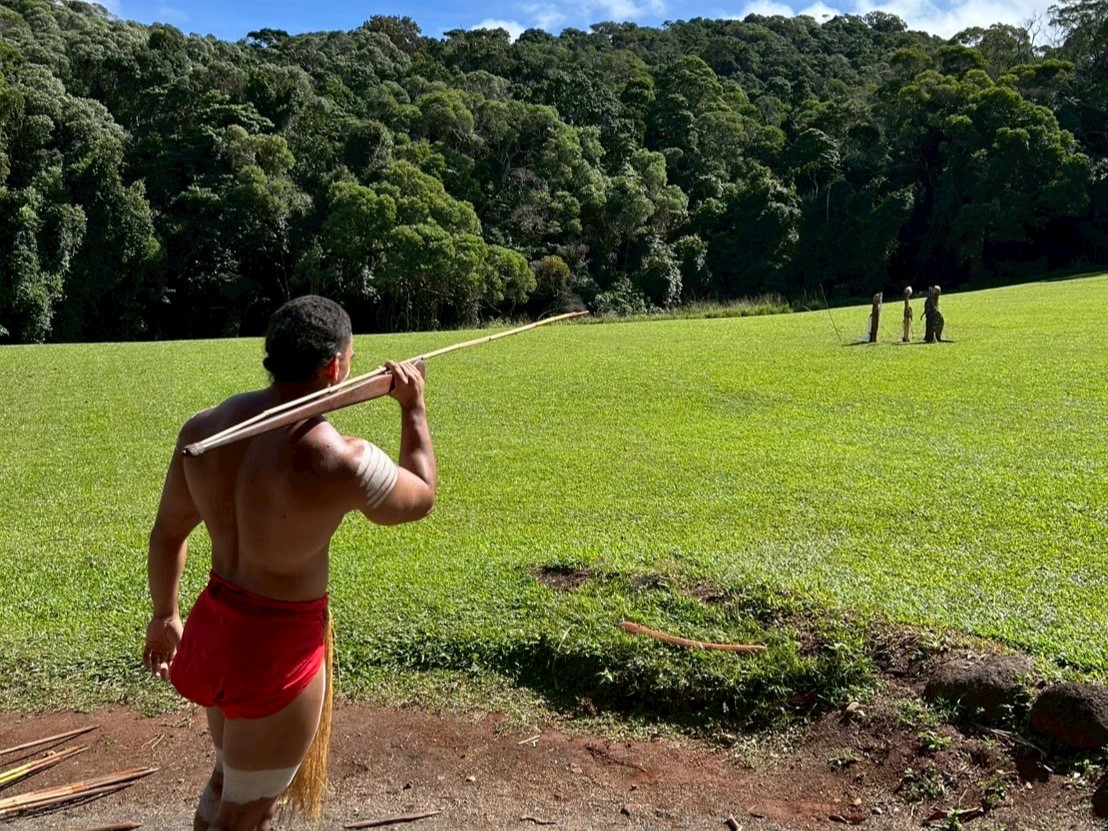 次は、シロアリに食べられて中が空洞になってしまったユーカリの木で作られるディジュリドゥという楽器の音色を聞かせていただきました。舌の使い方や息の吐き方によって、全く異なる音色となっていました。その後、狩りで使われる槍投げの様子を見させていただきました。スタッフの方でもなかなか的に当てることができず、槍投げの難しさを感じました。