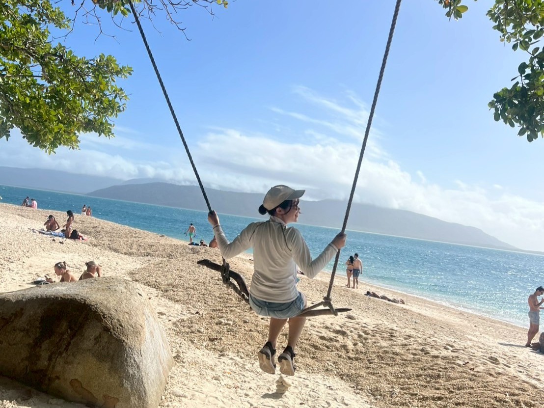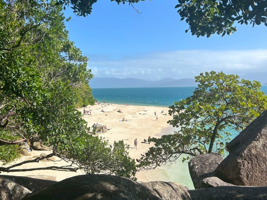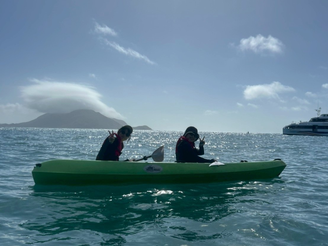 グラスボトムボートは英語ガイドのため理解することが難しかったですが、海に潜らないと見られないはずの海の中の様子を、濡れることなく見ることができました。この日は少し風が強かったこともあり、カヌーは自分たちの思うようにオールを漕ぐことができませんでした、、。最後に訪れたのは、フィッツロイ島の目玉スポットであるヌーディビーチ。10~15分ほど岩を上り、山を越えた先、木の間から見えるのはオーストラリアの最も美しいビーチにも選ばれたことがある絶景が待ってました。真っ白な砂浜に降りるとサンゴでできているため、歩くたびに風鈴のような音が鳴り、ビーチを歩くだけでも楽しかったです。白いビーチ、青い空と海の景色はとてもきれいで、写真を撮る手が止まりませんでした。