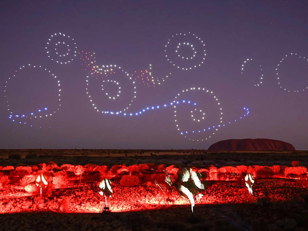 カナッペとスパークリングワインを片手にウルルサンセットを堪能した後、1000機以上のドローンを使用した光と音のドローンショーをお楽しみください。ディナーは地元食材のお洒落なバスケットスタイルです。