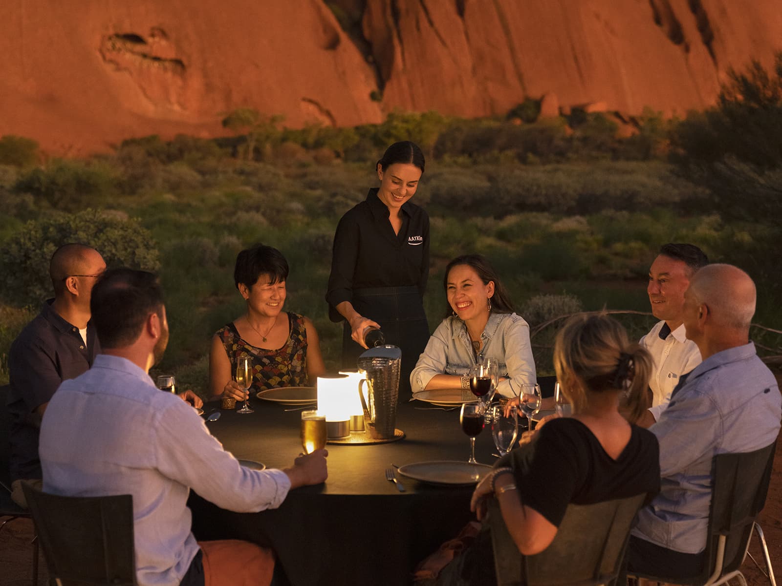 日没後、赤い大地、大自然の中での優雅なディナーをお楽しみ頂きます。夕食後はスタートーク。 -
