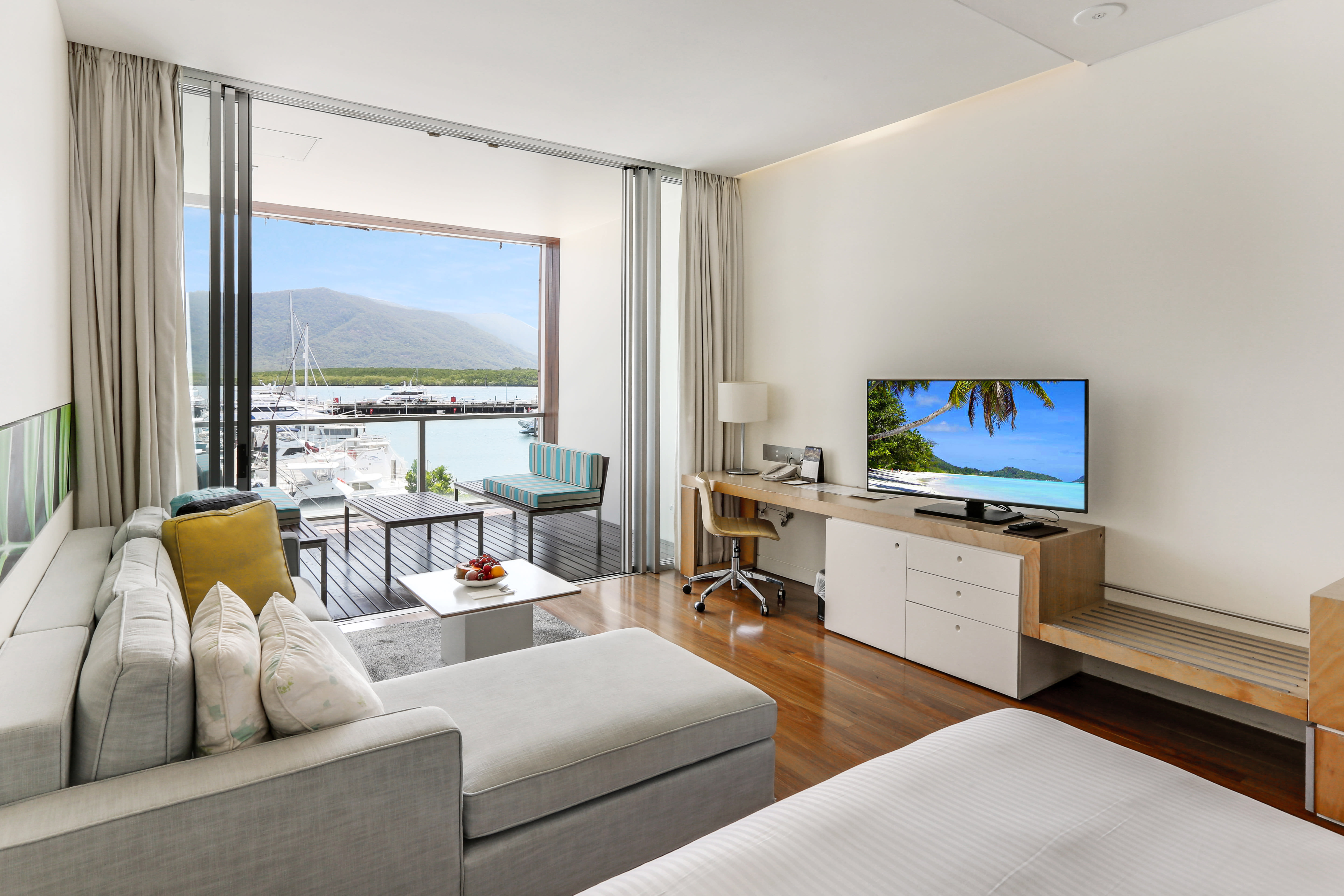 シャングリ・ラ ザ マリーナ ケアンズが誇る豪華な客室で、トリニティ湾とマリーナの絶景を楽しむことができます。こちらのお部屋は、サンライズ側のお部屋となりますので、水平線から昇る朝日をご堪能ください。広々とした設計とエレガントなインテリアが特徴で、床から天井までの大きな窓やプライベートバルコニーからの美しい景観が魅力的です。