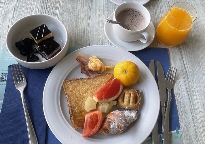 朝食会場はテラス席があり、景色を見ながら朝ごはんをゆったりとお楽しみいただけます。フルーツやデザートなど種類が多く、飲み物もカフェ系からジュース系までさまざま。またスタッフのホスピタリティは随一でした。親日家で、少し日本語を話せるスタッフもいました。