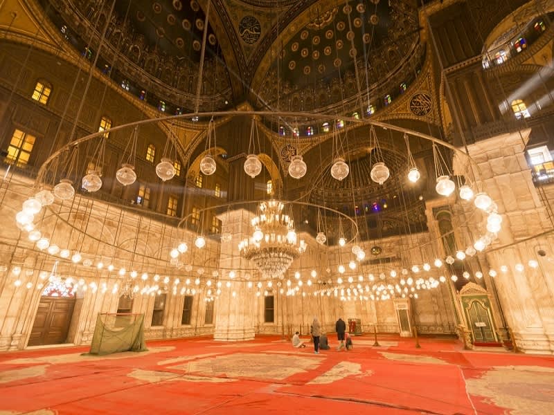 オスマン朝トルコの支配下からエジプトが近代化する基礎を築いたモハメドアリ。彼がトルコ/イスタンブールのモスクを模して作ったのがモハメドアリモスクです。他のエジプトの模す国は見られない特徴として、いくつものドーム、そして2本のミナレット(尖塔)があります。モスクの内部は大きなシャンデリア、幾重にも輪を描くランプと荘厳な空間になっています。モスク内部もさることながら、モスクのある高台から望むカイロ市内の景色もおすすめです。