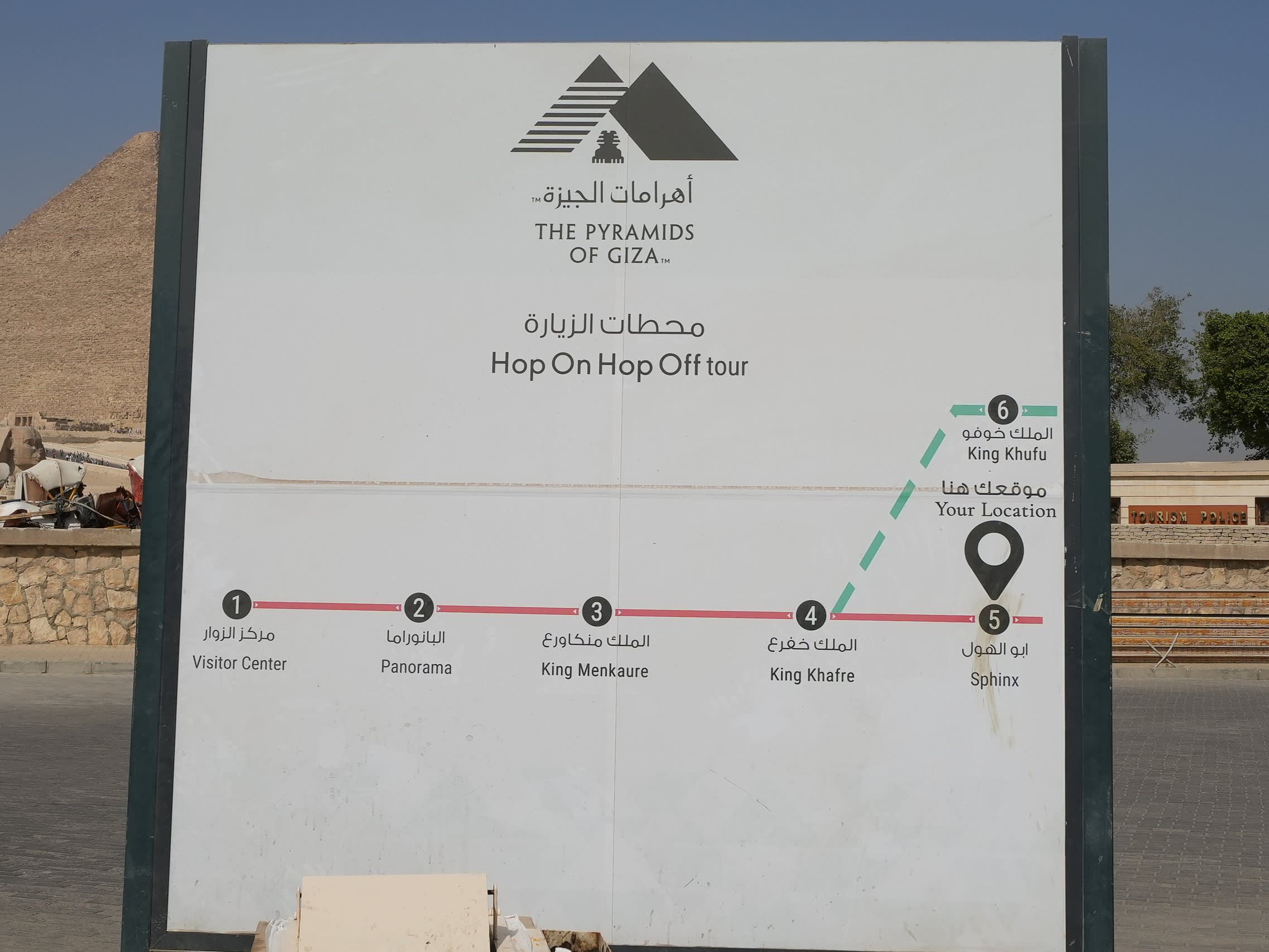 以前はピラミッドのエリアを車で回ることができましたが、2025年4月より内部へのプライベート車両の乗り入れが禁止され、メインゲートから巡回バスで見学する形にエリア内が整備されました。チケット購入をするメインゲート/ビジターセンターからバスに乗り、途中三大ピラミッドのビューポイント、カフラー・メンカウラーのピラミッド、そして終点スフィンクス前までつなぎます。三大ピラミッド最大のクフ王のピラミッドへはカフラー王のピラミッド前で乗り換えます。巡回バスはチケットに含まれ無料で利用できます。