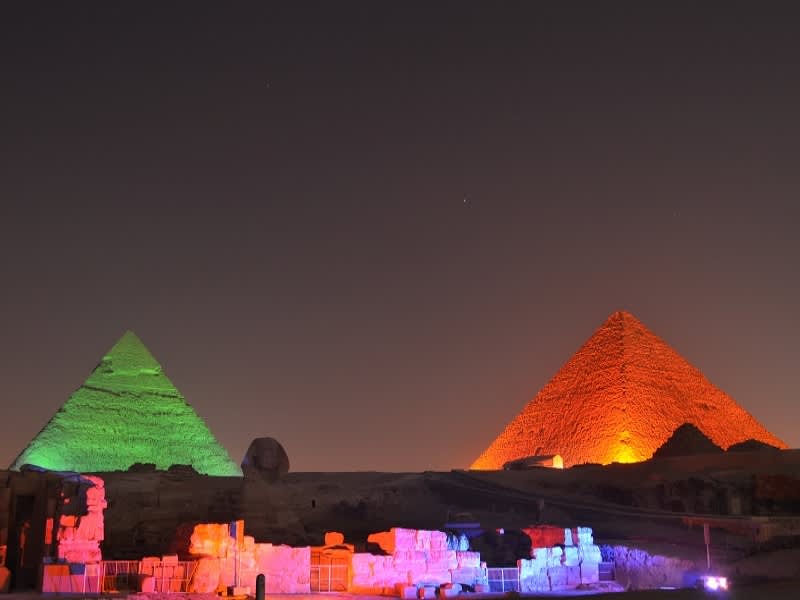 ギザのピラミッド、スフィンクスを望む広場ではエジプトの歴史を題材にしたライトあアップショー「音と光のショー」が開催されています。太陽に照らされ青空に映える日中のとは打って変わり、様々な色の光に照らされるピラミッド・スフィンクスの姿は一見の価値あり。