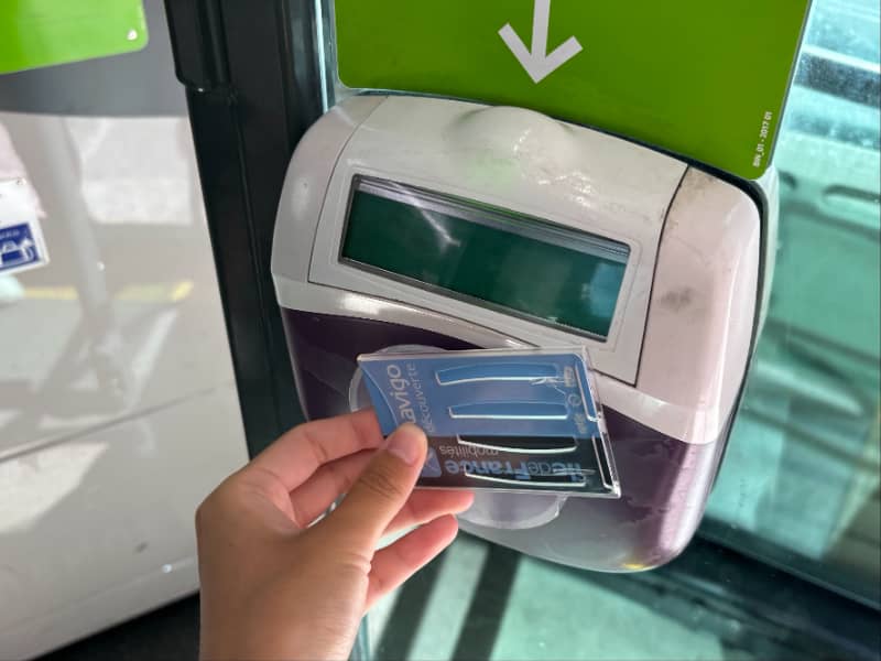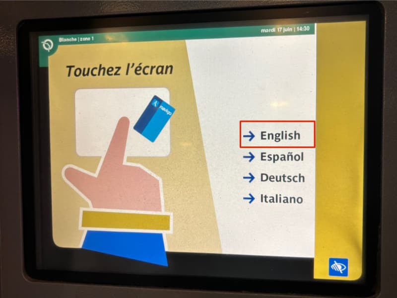 バス・トラムチケットをチャージした「Navigo Easy」を、乗車してすぐ右側にある機械にタッチします。