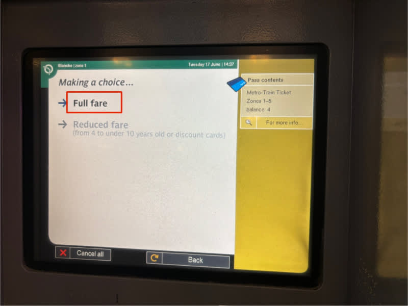 10歳以上でしたら、「Fullfare」を選択。 「Reduced fare」は子供やその他特定の割引対象者向けの割引証明カード割引価格です。 4歳から10歳は子供料金、4歳未満は無料です。 その後は購入時と同じ工程です。 チャージする回数選択、支払いまで進みます。