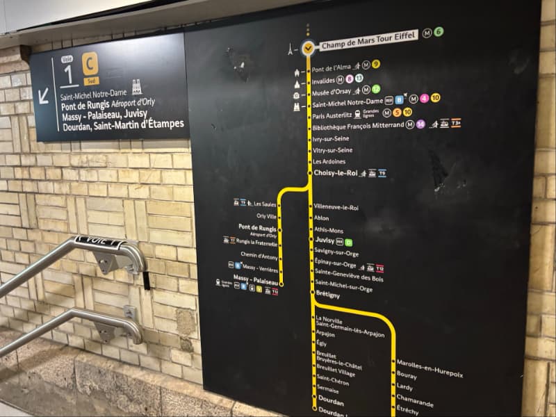 1つの路線に対して終点が1つだけのメトロと異なり、 RERの路線では、途中で線路が枝分かれしていて、終点が複数あることがあります。 そのため、例えば同じ「RER C」でも、乗る電車によって行き先が全然違うことがあるんです! 必ず路線番号だけでなく、「どの終点行きか」もチェックするようにしましょう。