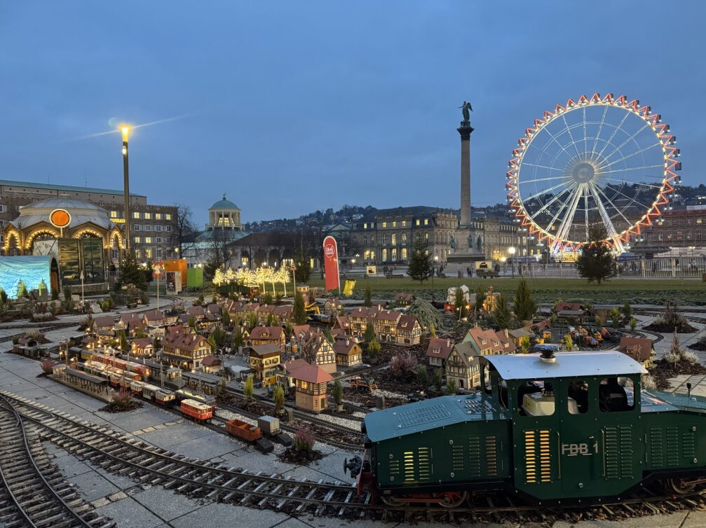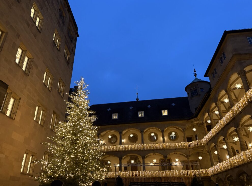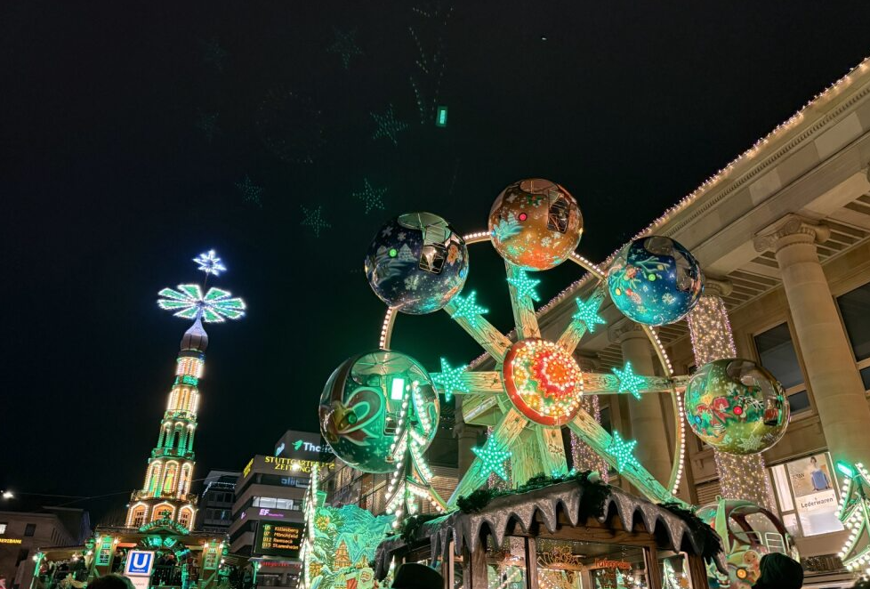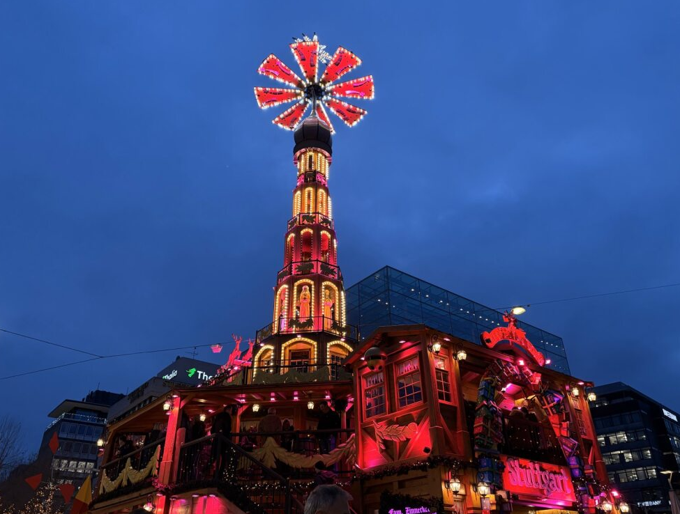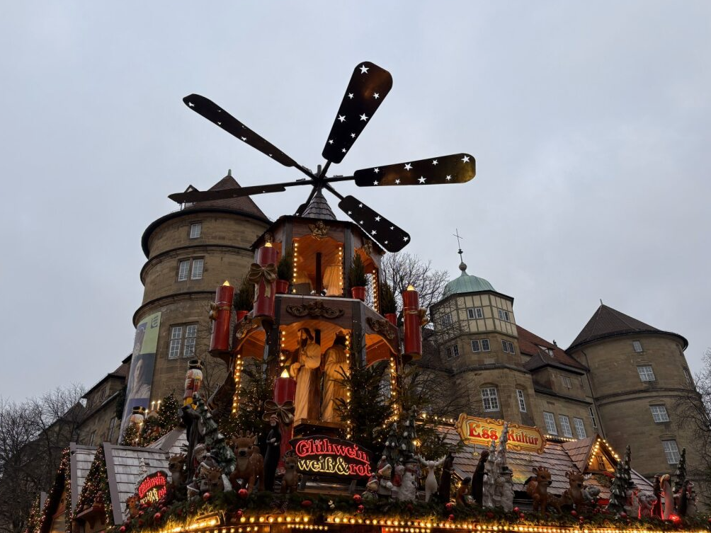 その後はシュトゥットガルトのクリスマスマーケットへ。ここはドイツ最大級の規模を誇り、最大の見どころは屋台の屋根の装飾です。屋台ごとに「優勝」を目指して力を入れているそうで、動いたり光ったりと、他では見られないほどクオリティの高い装飾が並びます。屋根の細部まで楽しむなら、明るい時間帯に訪れるのがおすすめです。