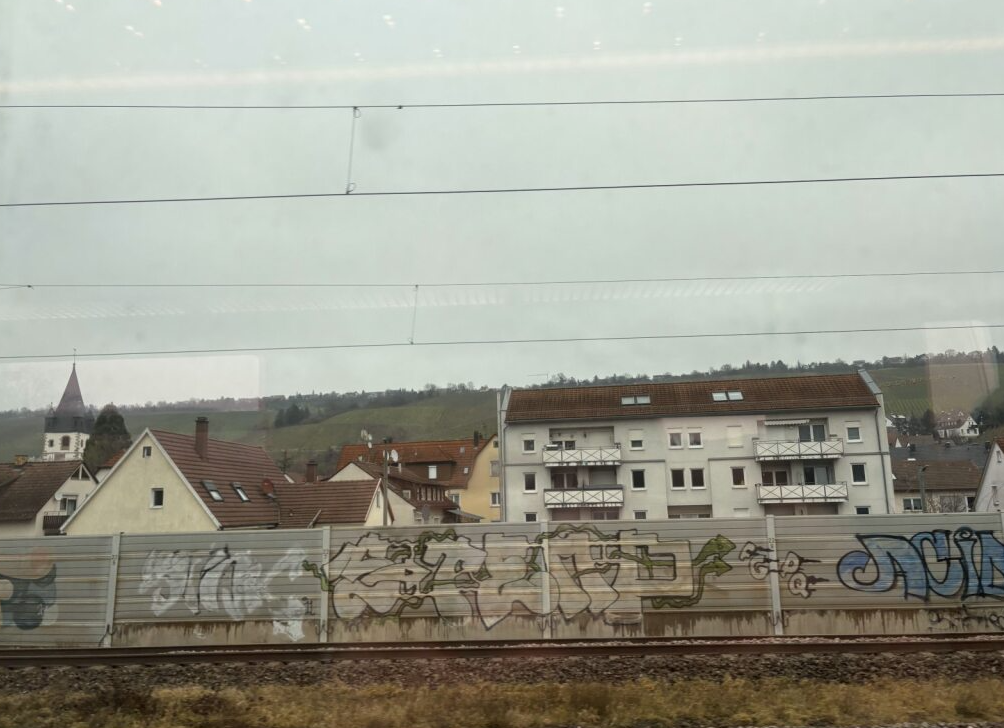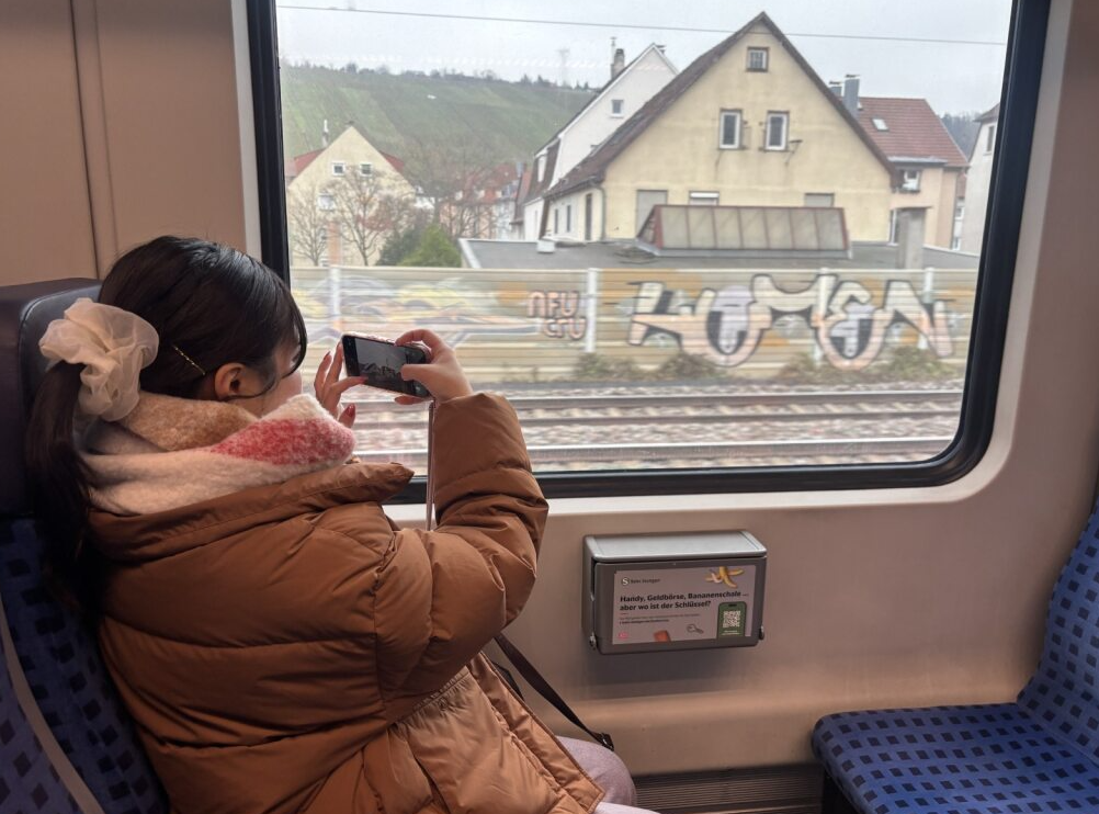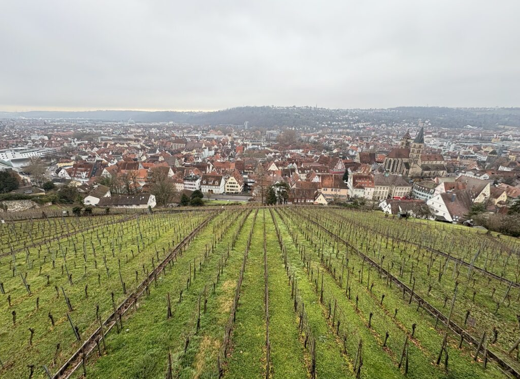 まずはシュトゥットガルトのホテルに荷物を預け、エスリンゲンへ出発しました。シュトゥットガルトからエスリンゲンまでは電車で約15分。10分に1本ほどの間隔で運行しているため、とても行きやすい場所です。車窓からはワイン畑が広がり、移動時間も楽しめました。