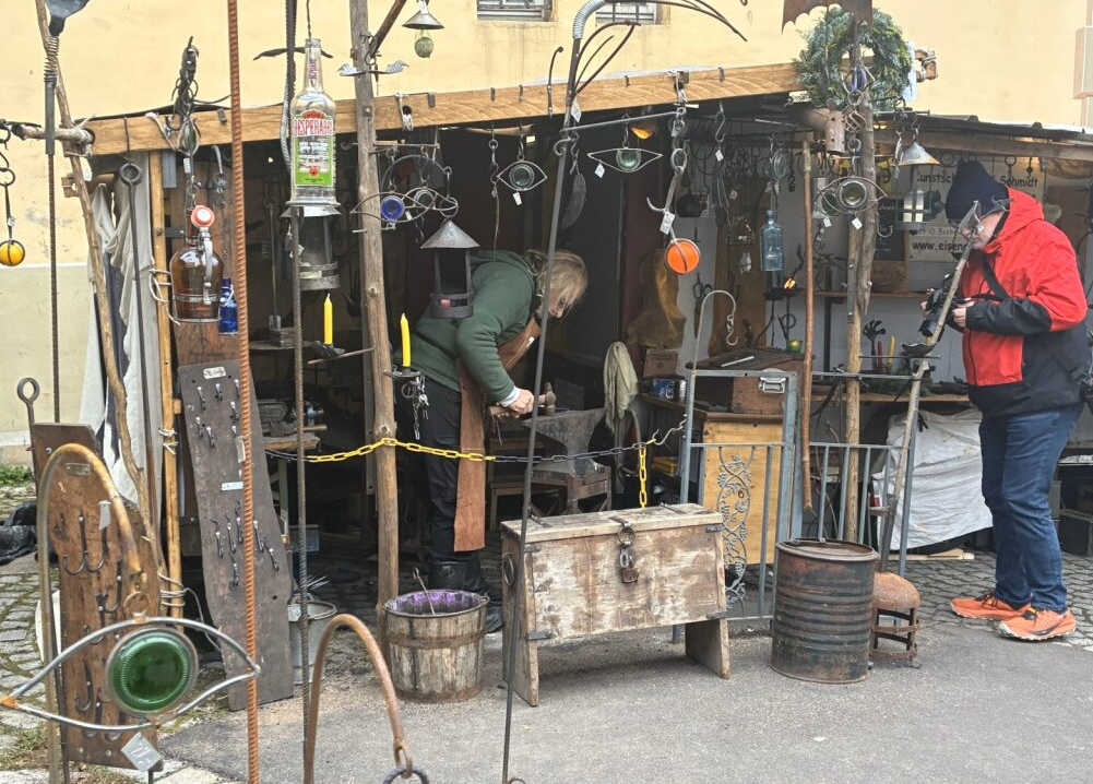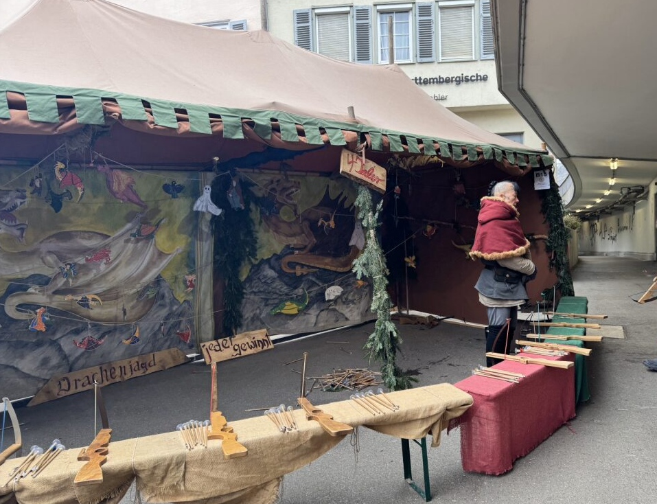 エスリンゲンのクリスマスマーケットは、「マルクト広場」「市庁舎広場」「ハーフェン広場」の3か所で開催されていますが、いずれも隣り合っているため回りやすいのが特徴です。お店の人たちは中世風のコスチュームを身にまとい、射的や錬金術を思わせる催し物もあり、まるでタイムスリップしたかのような雰囲気。観光客も多く、地元の子どもたちが楽しんでいる様子が印象的でした。