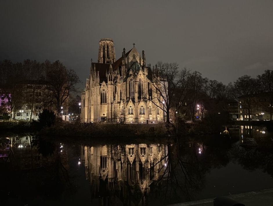 夜に訪れると、水面に光が映り込み、まるで教会が水に浮かんでいるかのような幻想的な光景が広がります。実は昼間にも訪れておりましたが、夜の方が断然おすすめです!とても美しく、ぜひ夜にも訪れてほしい場所です。クリスマスマーケットから徒歩20ほどと散歩がてら行けるのも◎