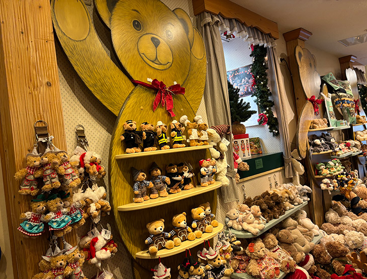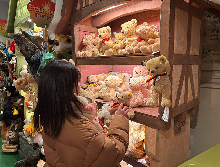 ドイツ製の愛らしいテディベアが数多く並び、お土産選びにもぴったりのスポットです。