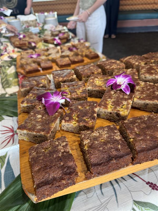 乗船後は、ハワイ産コナブレンドコーヒーと自家製パイナップル・バナナブレッドでひと息。