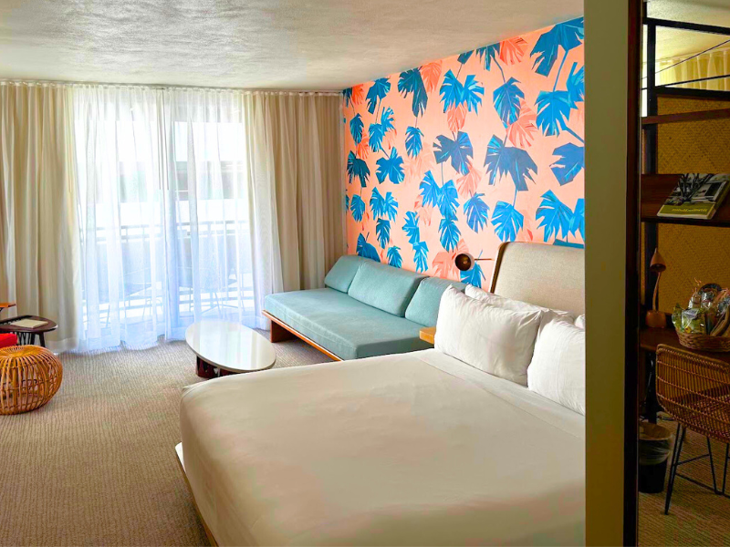 ザ・レイロウ・ワイキキ、オートグラフ・コレクションのシンボルでもあるピンクと紺のモンステラ柄が全室ベッドルームの壁に一面描かれています。トロピカルなミッドセンチュリーモダンな家具、歴史のあるアンティークの絵画など、細かいところまでおしゃれにデザインされています。全室に用意されているウクレレは、ロビー階で開催されるウクレレレッスンで使うことができます。客室でもSNS映えする写真がたくさん撮れることまちがいなし!