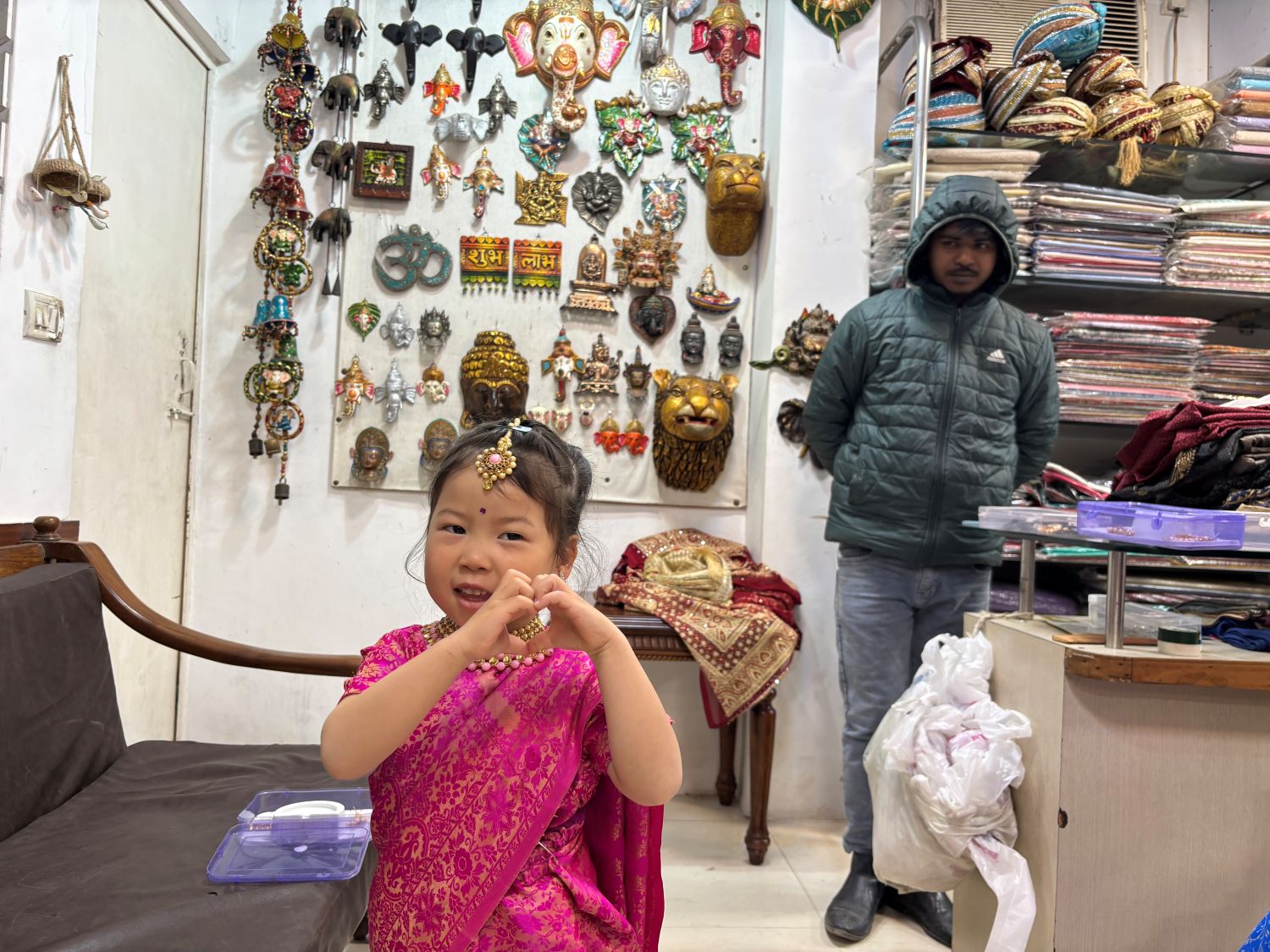 娘も眠たい目をこすりながら、念願のサリーを着るために頑張って置きました!!