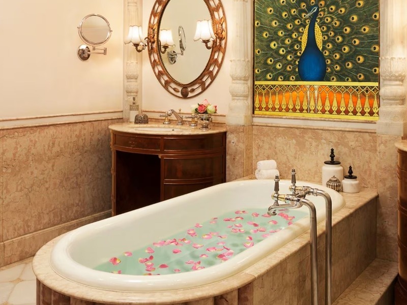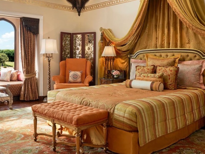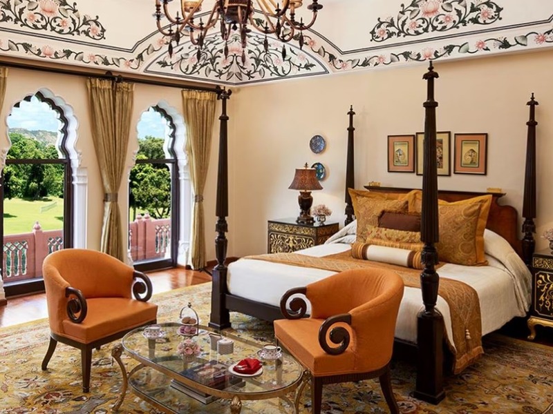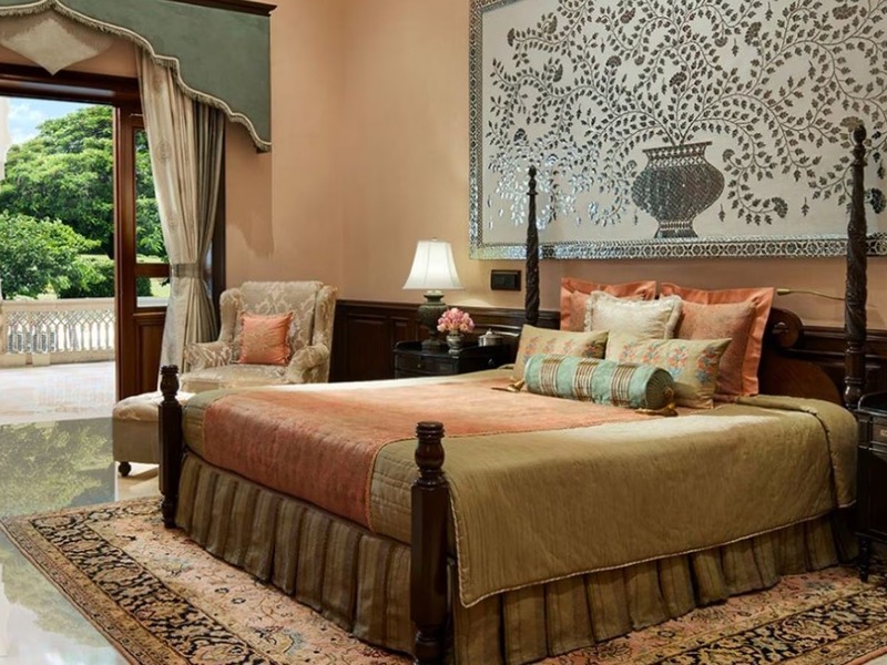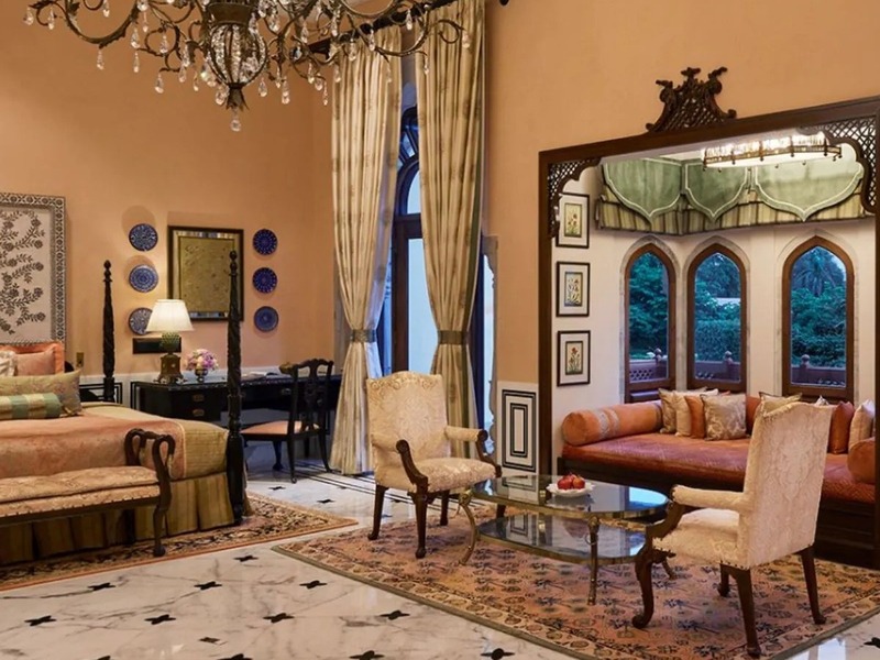 宮殿の歴史的な魅力を残しつつ、改装されたスイートルームはラジャスタンの美術作品や薄手の布で彩られています。各部屋にはベッドルームと独立したリビングルームがあり、床は洗練された大理石または木材で仕上げられています。天井が高くドーム状になっており、窓も宮殿をほうふつとさせる形となっており、全体的に開放感があるのが特徴的です。