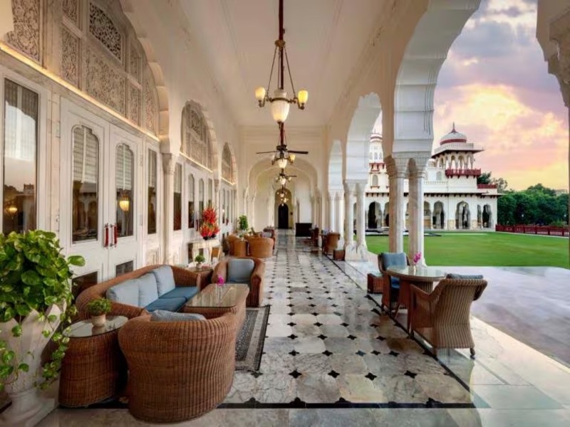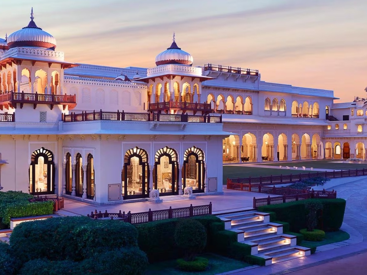 1835年に建てられたランバーグ宮殿は、もとは王妃付き侍女のための庭園の別邸として造られ、その後は王族の迎賓館や狩猟の館として用いられました。20世紀初頭には大規模に増築され、ジャイプール藩主サワーイ・マン・シング2世の本邸となります。インド独立後、藩王はこの宮殿を国内初の「宮殿ホテル」へと改装し、1972年に経営はタージ・ホテルズへと引き継がれました。以来、建築遺産を守りつつ五つ星の快適さを備えた館として受け継がれています。