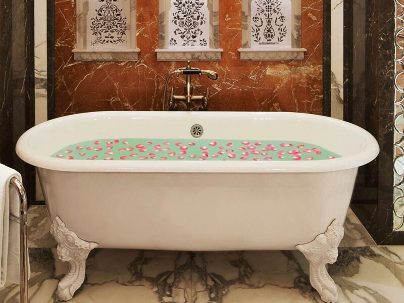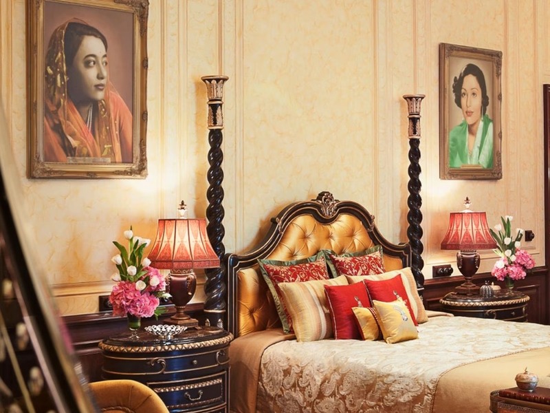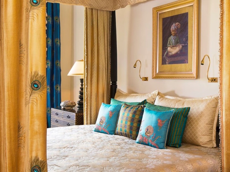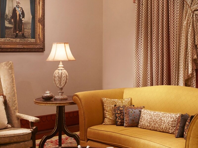 このスイートルームは、かつてジャイプールのマハラジャの私室として使われていたこともあります。リビングエリアとベッドルームを備えたこの部屋は、気品と懐かしさにあふれ、ひとたび足を踏み入れれば、たちまち過ぎ去った時代へと誘われます。壁は黄金色に塗られ、ベッドやソファは上品な水色で統一された、とても美しいお部屋です。