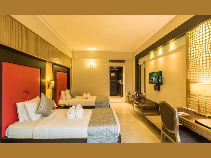 室内は白、黄土色、そして赤を基調とした温かみのある雰囲気で統一されています。室内には電気ケトル、ミニバー、バスローブとスリッパ、ワードローブ、32インチテレビ、Wi-Fiが完備されており、ルームサービス、無料の朝食などの特典も含まれています。