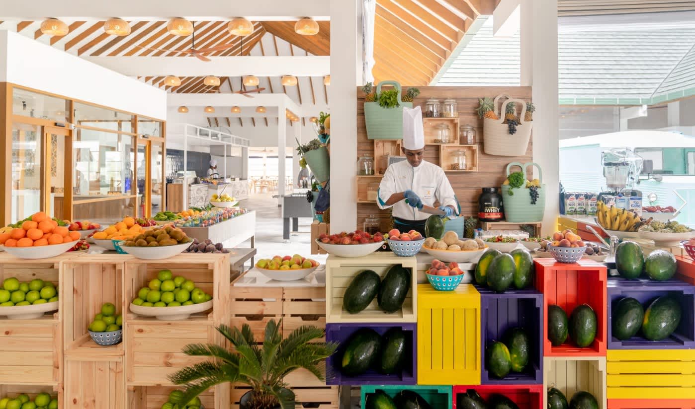 市場をコンセプトに、獲れたての魚市場、フレッシュな野菜やフルーツ、ワゴン販売でのホットミールなど各セクションごとに分かれたフードビュッフェでは、板に値段の表示があったり自転車が置いてあったりと本当にお買い物に来たかのような演出がなされ、朝から夜までショッピングのわくわく感を提供してくれます。
