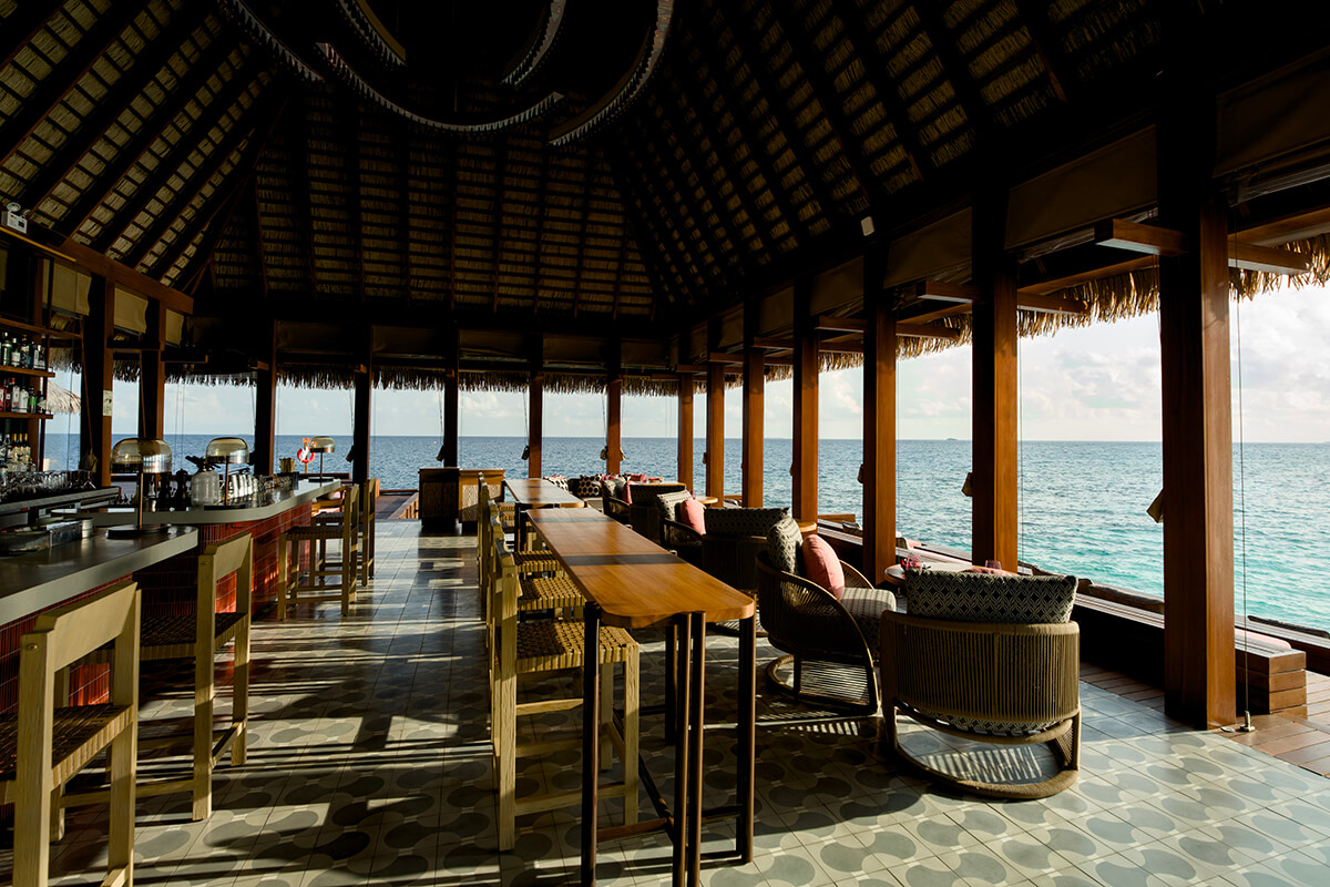 水上にせり出したデッキで水平線のパノラマとともにモルディブをはじめ世界各国から取り寄せた極上の食材でシーフード料理を楽しむことができます。