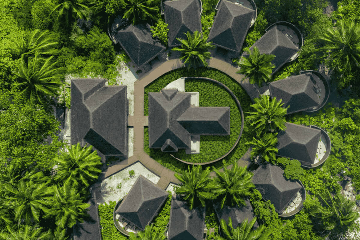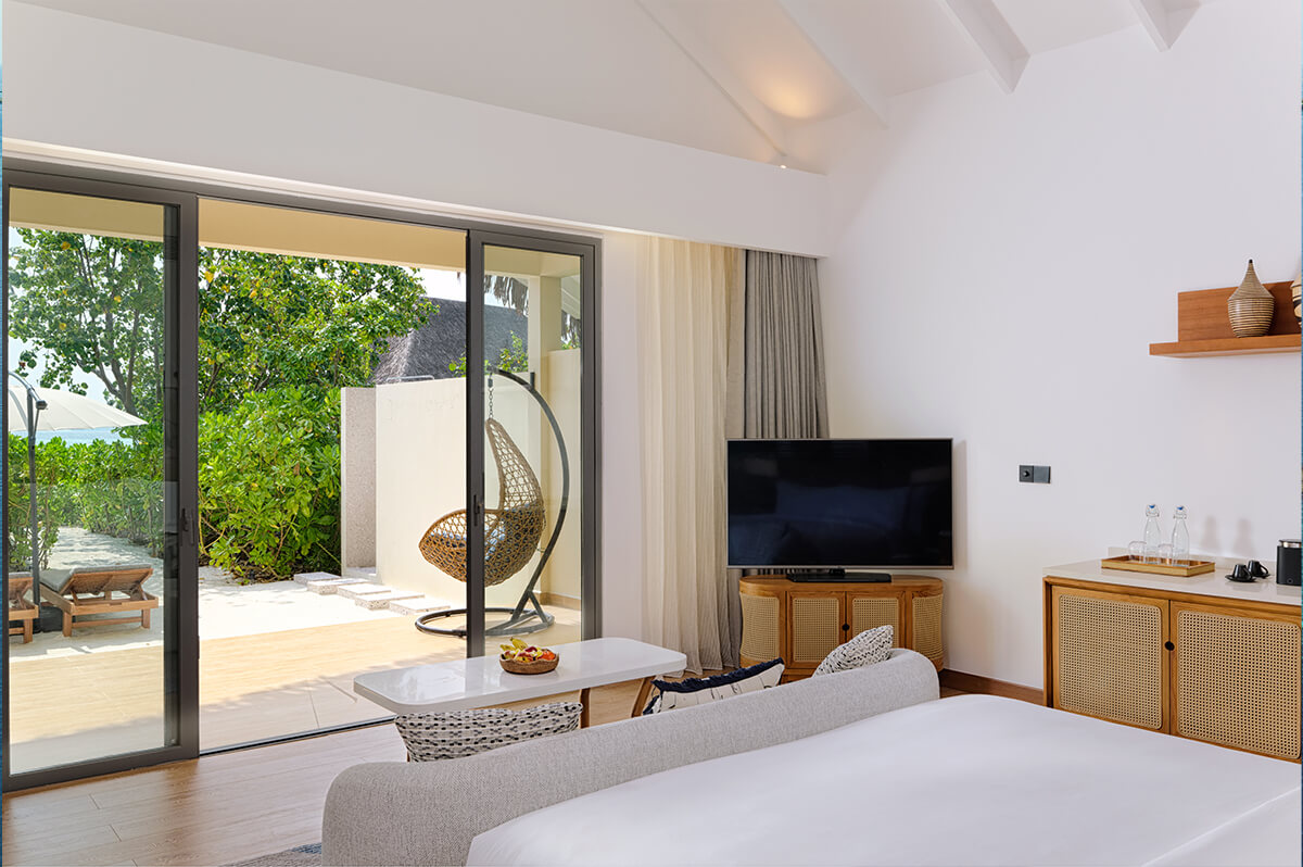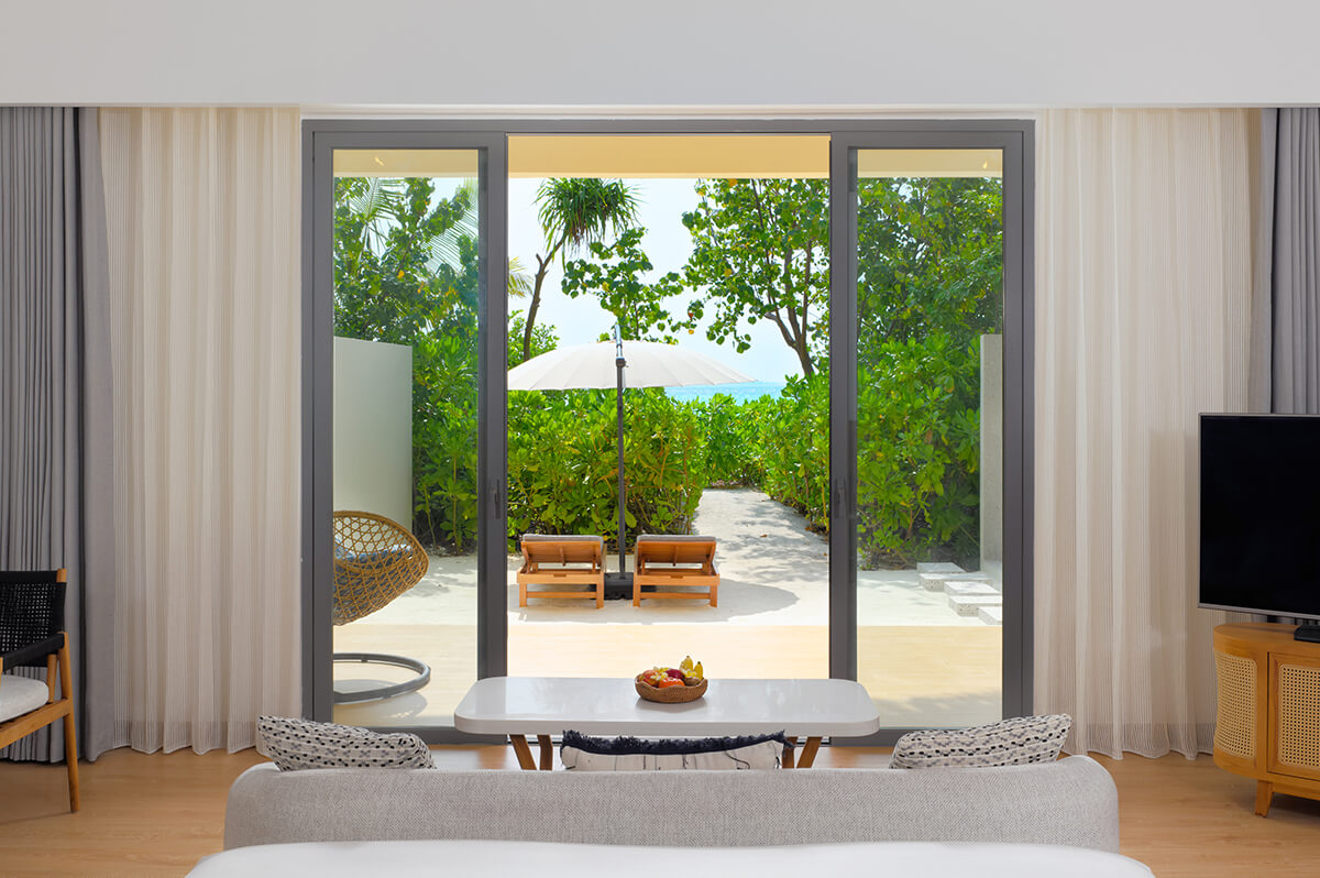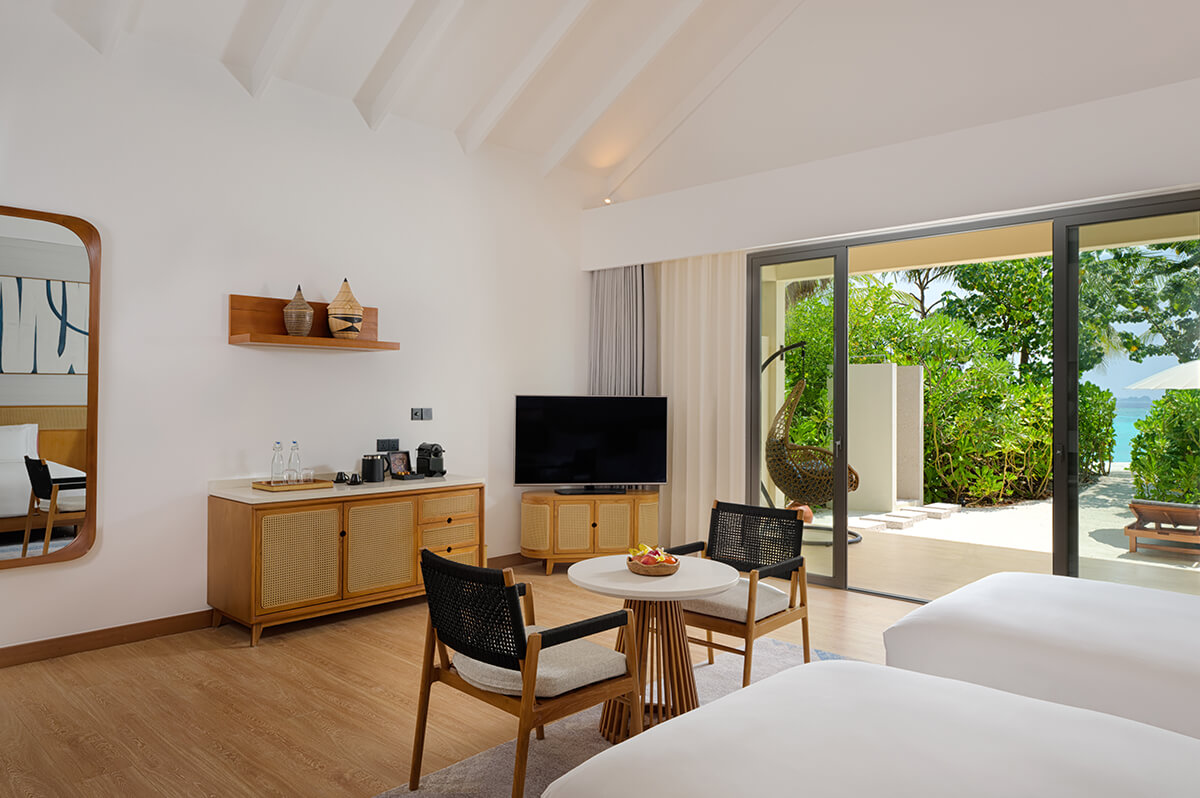 豊かな緑と白い砂浜に囲まれたビーチヴィラ。ビーチへ直接アクセスできます。ファミリーで利用する場合は、キングベッドとツインベッドのヴィラを接続することも可能です。