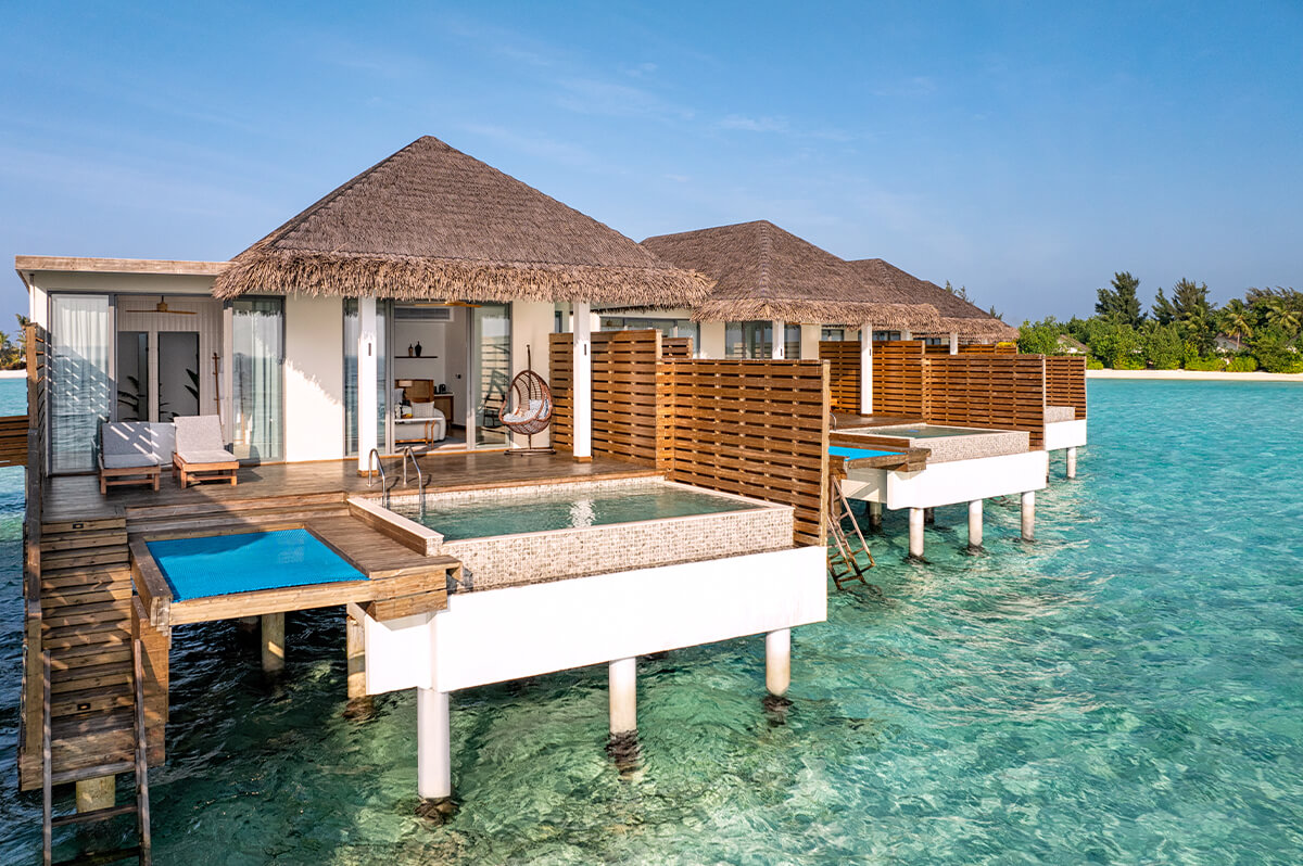 シンプルな造りですがオシャレで可愛らしいデザインが印象的な水上ヴィラ。海への階段、ハンモックも付いています。