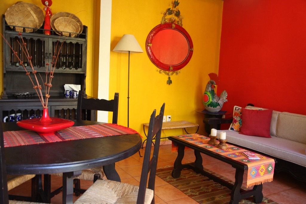 中庭にはブーゲンビリアの花が咲き、タイルや家具のデザインまで、すべてが絵になるお部屋。