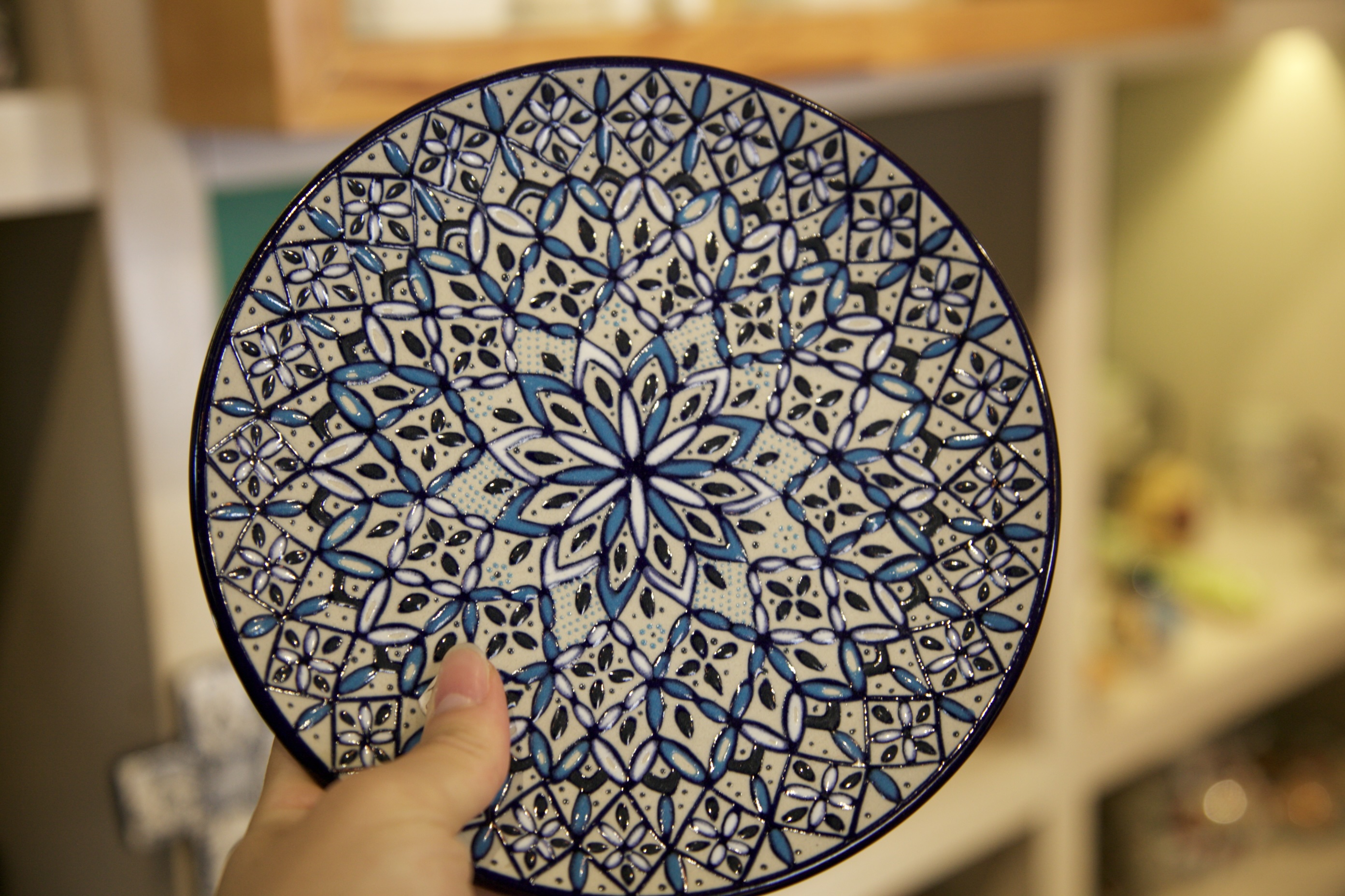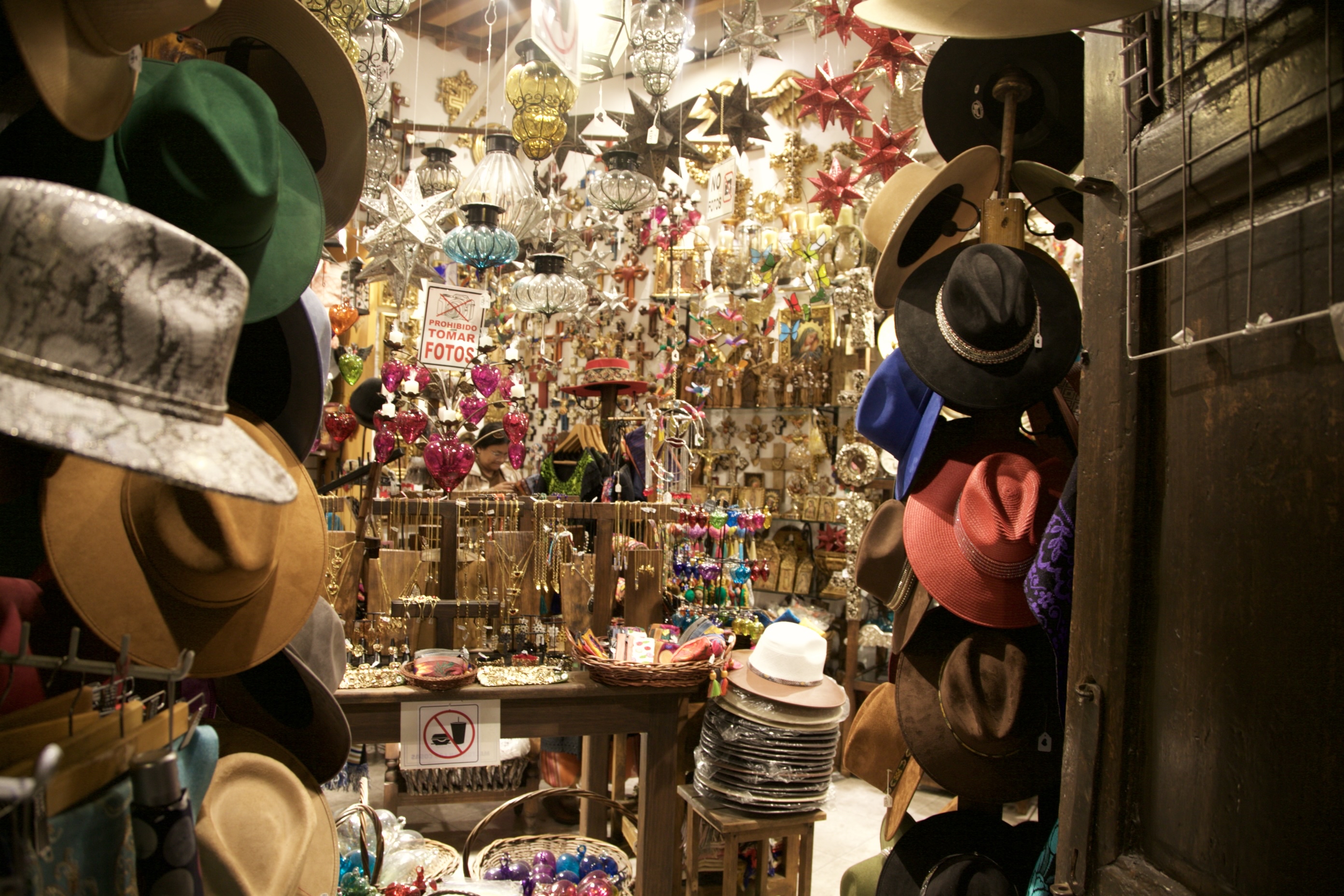カラフルな陶器や革のバッグ、手作りアクセサリーなどが所狭しと並び、