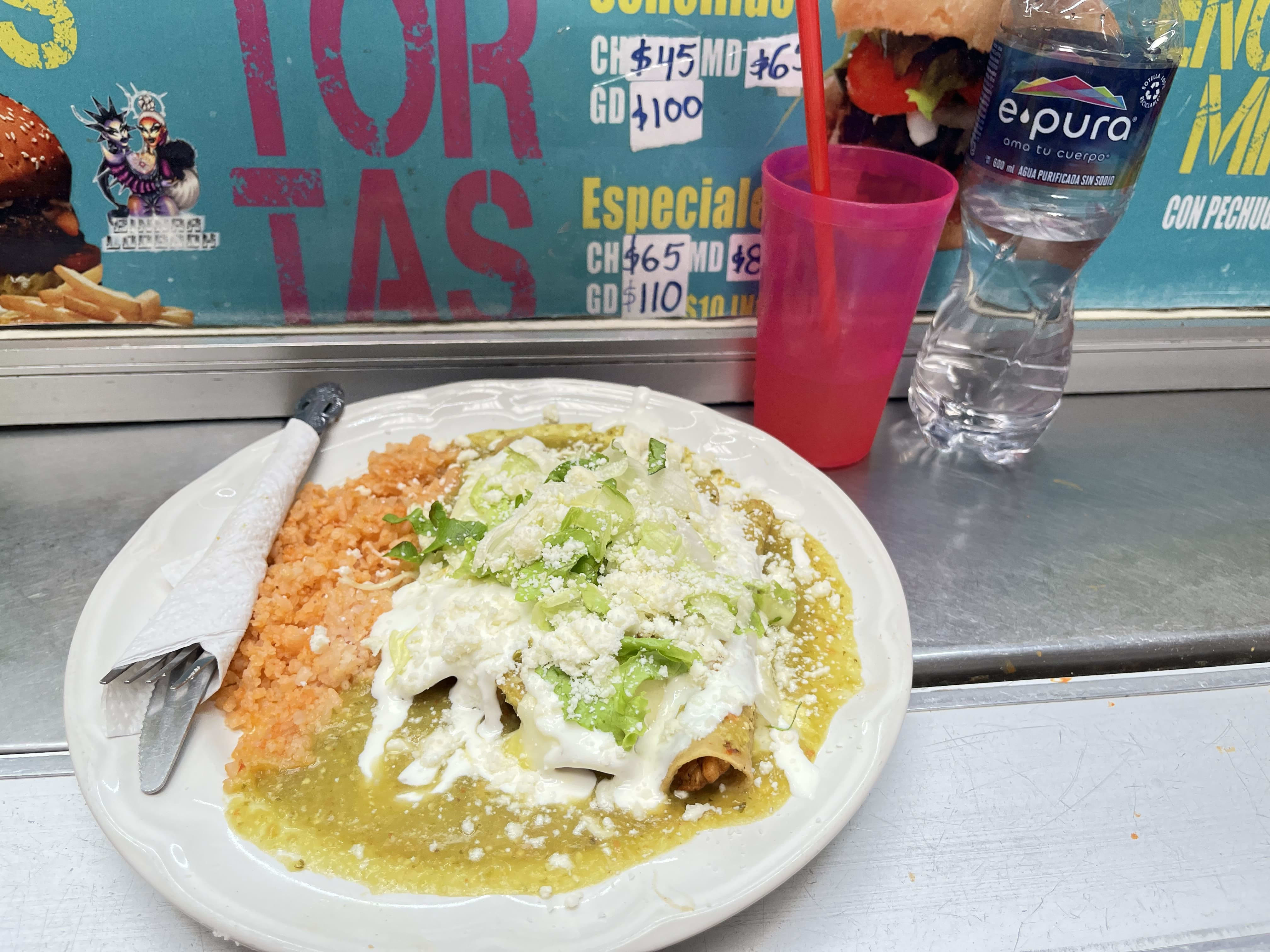 イダルゴ市場は、1階に食堂、2階にお土産エリアという構造で、ここで少し遅めの昼食をとることに。本当はグアナファト名物の「エンチラーダ・ミネラス」を食べたかったんですが、メニューにずらりと並ぶ料理名の中から「Enchiladas」の文字だけを頼りに、うっかり「エンチラーダ・ベルデス」を注文してしまいました。これはグアナファトだけでなくメキシコ全土で食べられるのに...でもこれがまた、緑のソースが効いたピリ辛の一皿で、想定外ながらも美味しくいただきました。