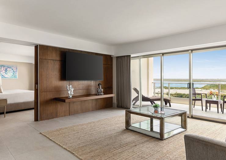 キングサイズベッドと広々としたバルコニーから眺める象徴的なサンセットが魅力のこのスイートルームでは、美しいラグーンと豊かなマングローブのジャングルの景色をお楽しみいただけます。