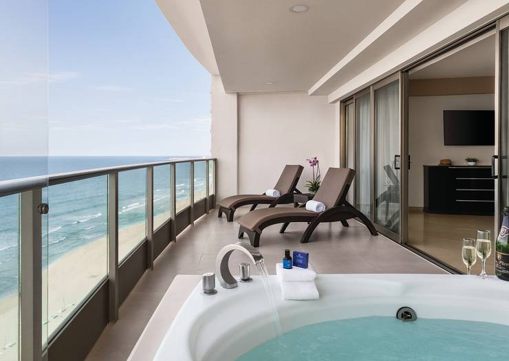 このお部屋には、キングサイズベッド1台またはダブルベッド2台、素晴らしい海辺の景色、豪華なアメニティ、専用の屋外バスタブが備わっています。