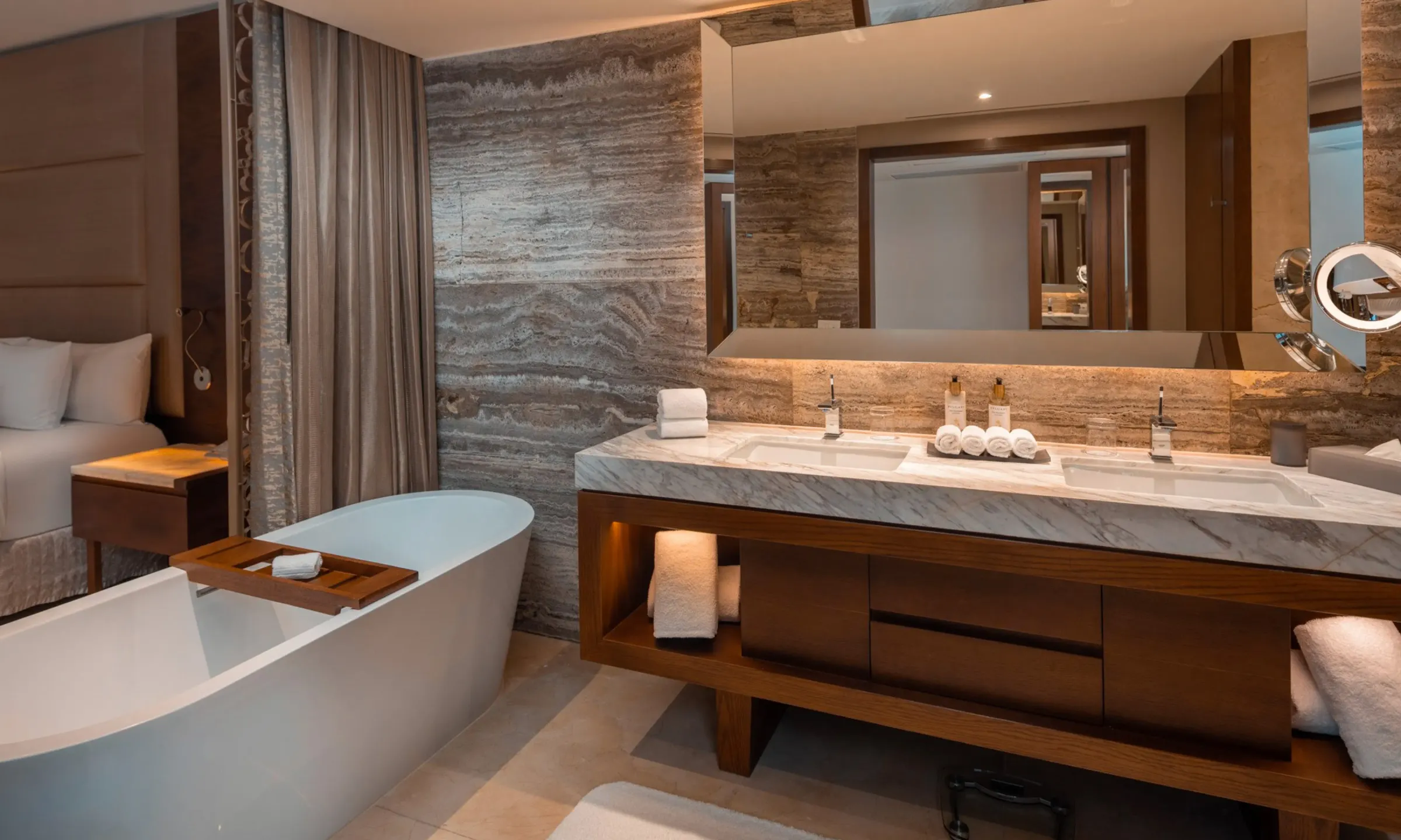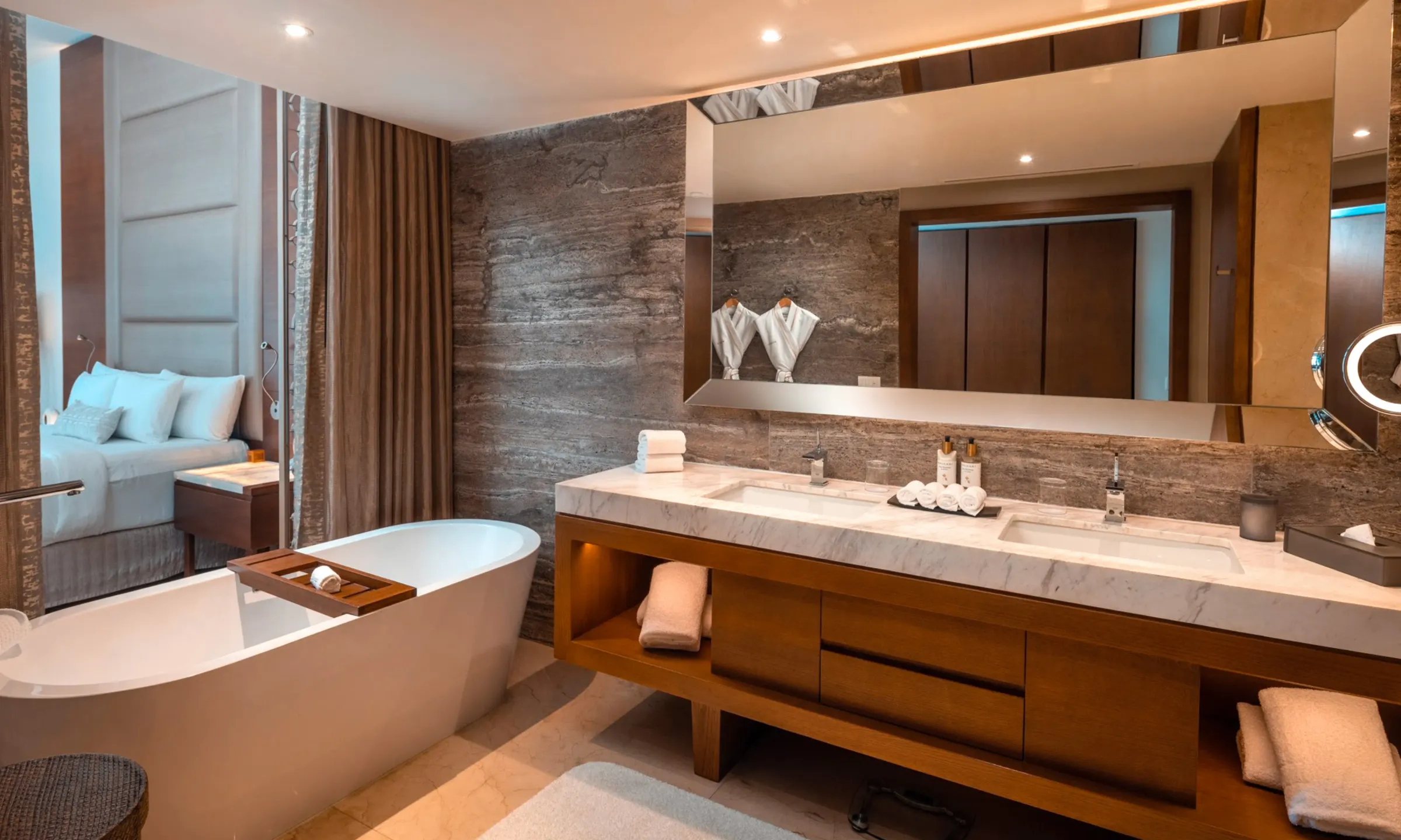 ダブルシンクの洗面台や独立バスタブ、海を望むバルコニーなど、ふたりで心地よく過ごせる設計です。