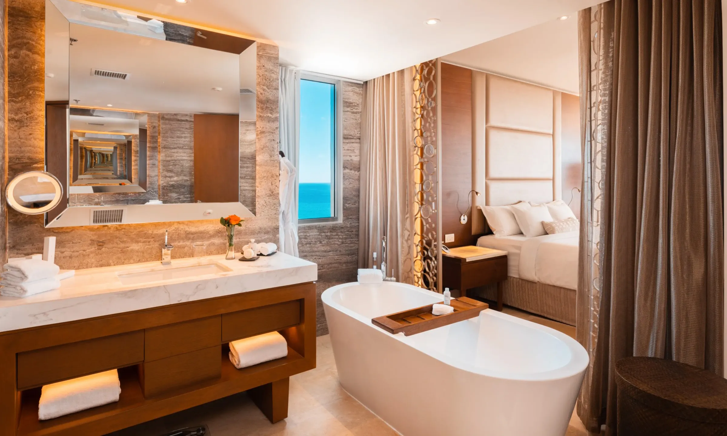 オーシャンビューのジュニアスイートは、ベッドルームとリビングエリアがゆるやかにつながった広々とした空間です。