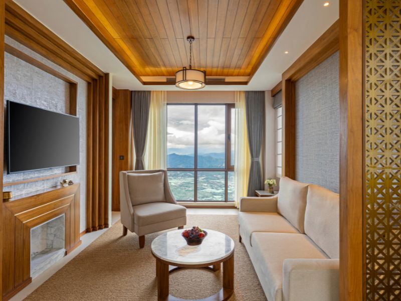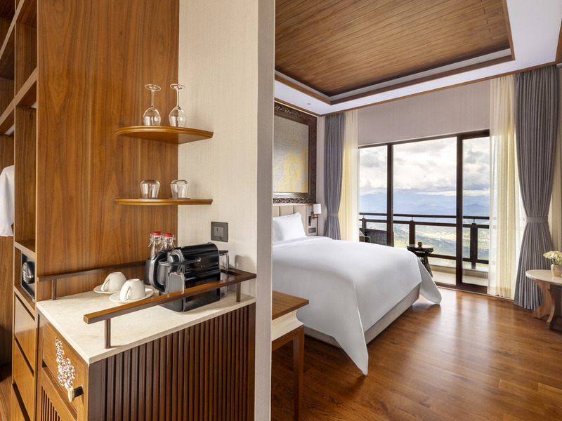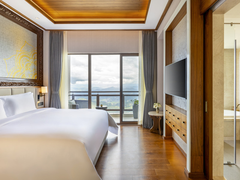 キングベッド 1 台のお部屋です。リビングスペースや寝室が分かれており、窓からはヒマラヤ山脈を一望することができます。他のお部屋と同様、ソファが備え付けられたバルコニー付きです。