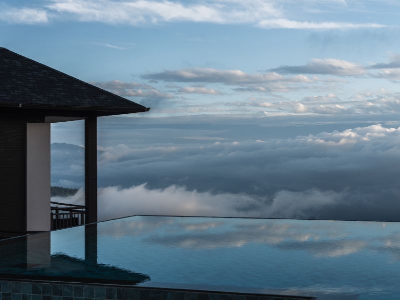 当リゾートの屋外プールでは、このように天空のような景色を眺めながらプールをお楽しみいただけます。プールバーも併設されている為、泳がずともこの景色を堪能しつつお酒をのむ、といった贅沢な時間もお過ごしいただけます。山の上に位置するホテルだからこその体験を、当リゾートでぜひ。