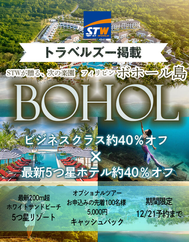 日本から約5時間弱のフィリピンは、おおよそ7,000にもおよぶ島々からなり、年平均気温26~27度と気候は快適な楽園リゾート。雰囲気が漂うアットホームなリゾートから、施設の整った大型リゾートまでたくさんあり、マリンスポーツやアイランドホッピングなどのアクティビティを楽しむことが出来ます。ビーチリゾートで有名なセブ島はマリンスポーツの宝庫でフィリピン旅行の中でも一番人気のエリアです。他にも巨大なショッピングモール群が建ち並び、ショッピングや街散策が面白い首都のマニラ、世界のベストビーチにも選ばれたホワイトサンドと透明度抜群の海のボラカイ島、 フィリピン最後の秘境と呼ばれるオールインクルーシブの1島1リゾートのエルニド、海ではイルカやウミガメ、陸では世界最小のメガネザル、ターシャと出逢える自然の宝庫ボホール島など、ご旅行、観光目的から行き先を選ぶことが出来るアジアの中でも人気のプレミアムアイランドです。セブ島やマニラ等弊社現地支店もございますので安心してご旅行をお楽しみください。フィリピンの海外旅行・ツアーならエス・ティー・ワールド(STW)へ!フィリピンの海外旅行・ツアーのプランを多数ご用意しております。