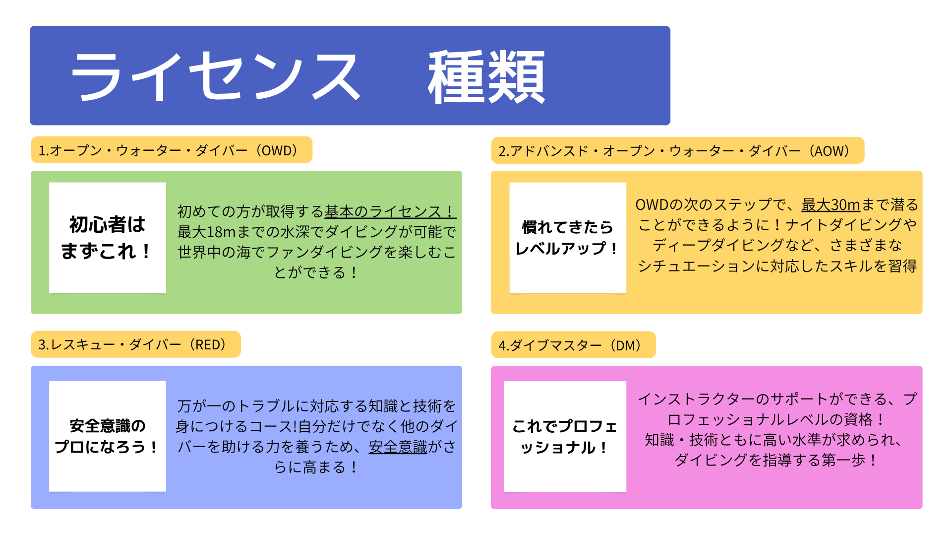 ダイビングにはさまざまなライセンス(Cカード)があり、