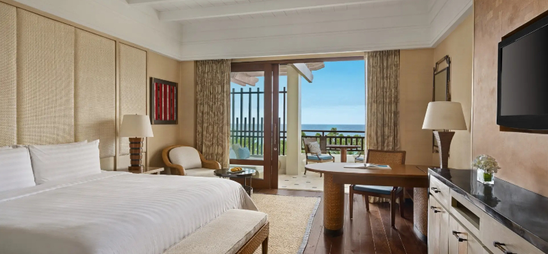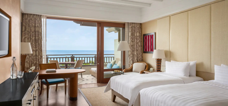・リゾート到着後、ロビーから一直線に望む海までの吹き抜けの景観は、まさに圧巻の一言です。