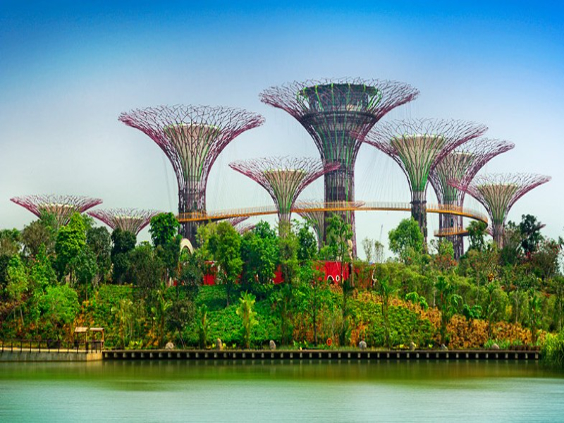 巨大ドームとスーパーツリーが並ぶ、未来都市のような植物庭園。