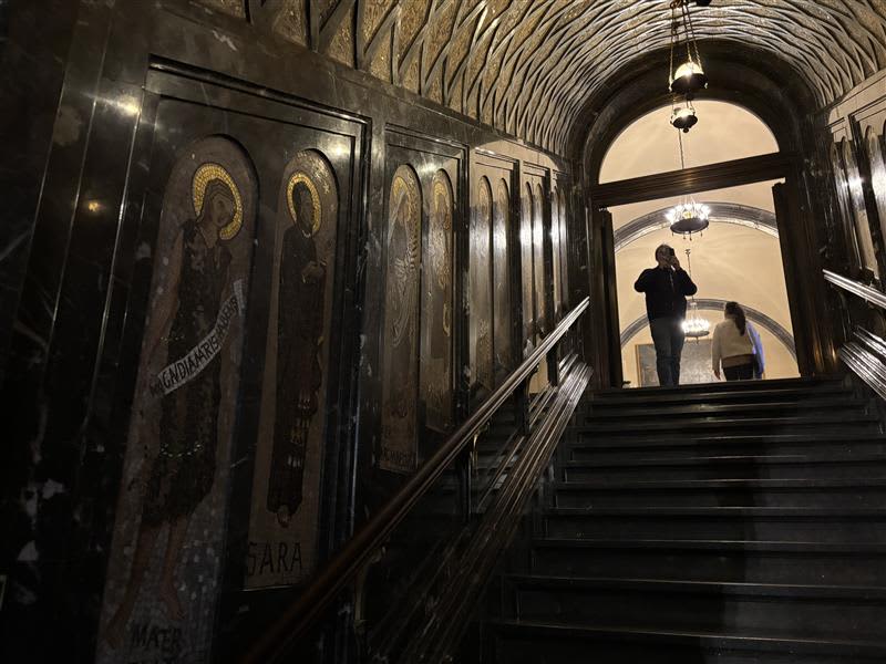 金色のモザイクタイルで描かれた美しい壁画と、天井から吊り下げられたランプが、神秘的で厳かな雰囲気を醸し出しています。