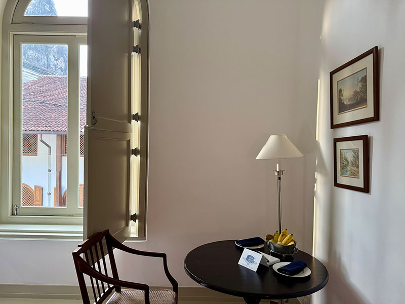 私が滞在したのは”ベッドルーム”という2階のお部屋。緑の木製ドアを開けると、通学中のスリランカの女学生たちの姿が見え、どこか懐かしいような、温かな風景に出会えました。