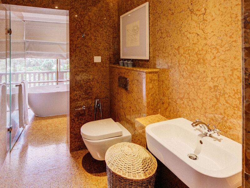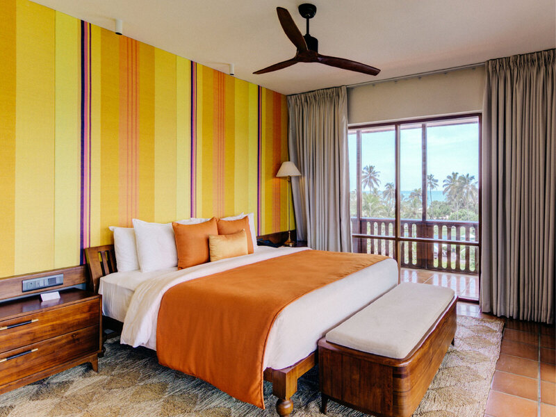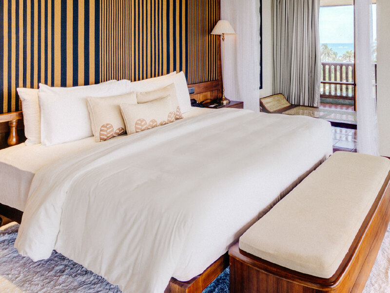 スリランカ周辺では世界で確認されている80種のうち26種のクジラが観察され、12月から4月にかけて南海岸ではマッコウクジラやシロナガスクジラが多く見られます。こちらのスイートは、ホエールウォッチングやクジラをテーマにしたアートで彩られ、生命の躍動を感じさせる空間となっています。ベッド背面のファブリック「ドライゾーン・ジャフナ(1978)」には、南から北へと続くスリランカの風景が織り込まれており、すべてのアートワークは地元の素材と職人技によって制作されています。