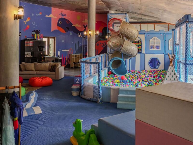 サンゴをテーマにしたクッションが空間を彩り、鮮やかなサンゴ礁のような色彩でまとめられています。