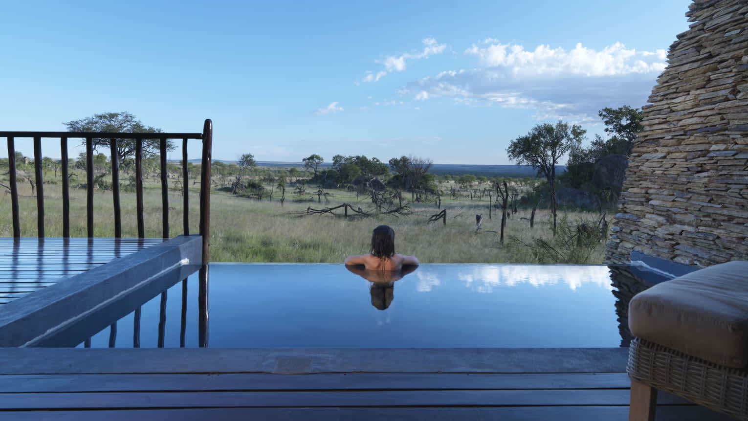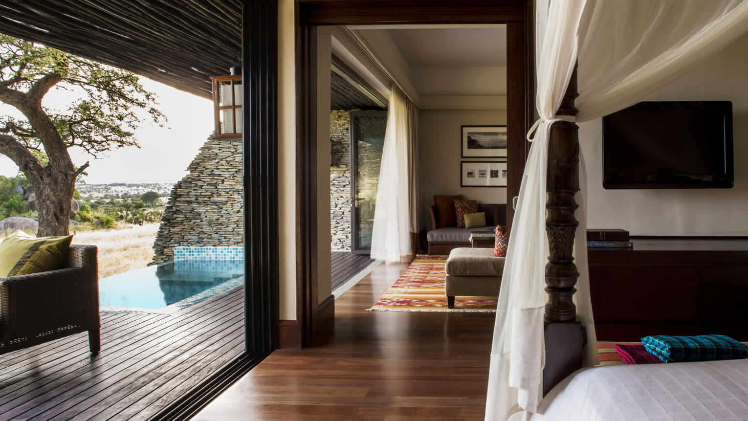 セレンゲティの平原を一望できる高台に位置する、プライベートプール付きの客室です。広々とした室内にはベッドルームの他、ラウンジエリアも揃います。もちろん、その名の通り、オープンエアのテラスも備えます。