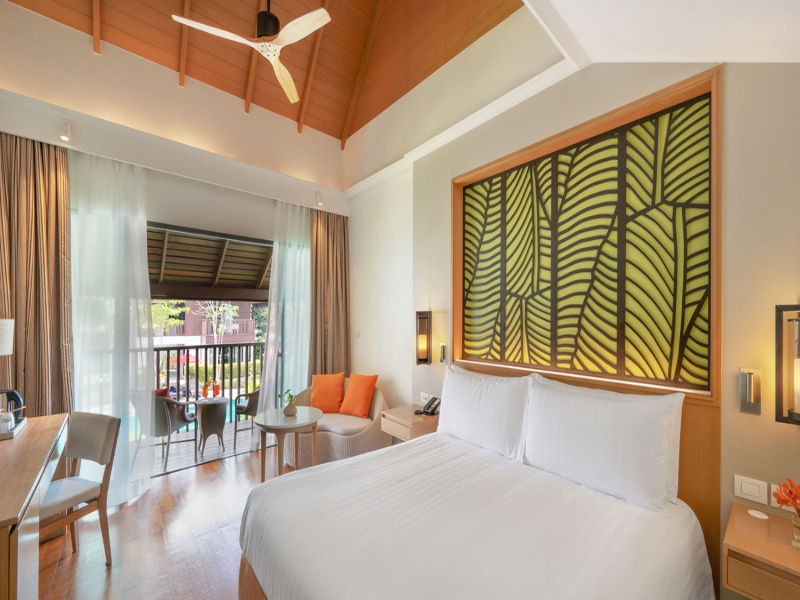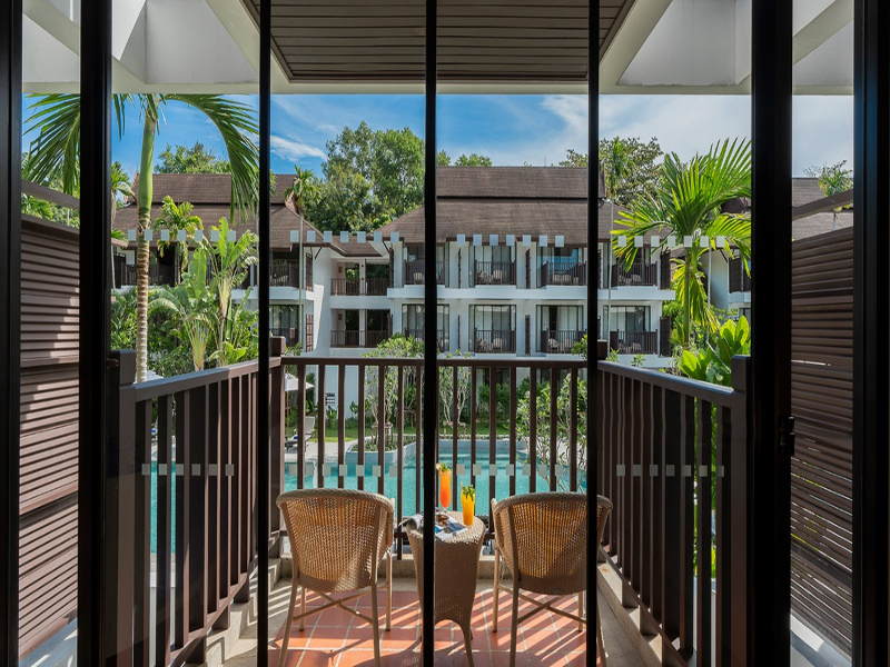 ヤシの葉がそよぐ音に耳を傾けながら、バルコニーからのプールビューを楽しめるスーペリアルーム。